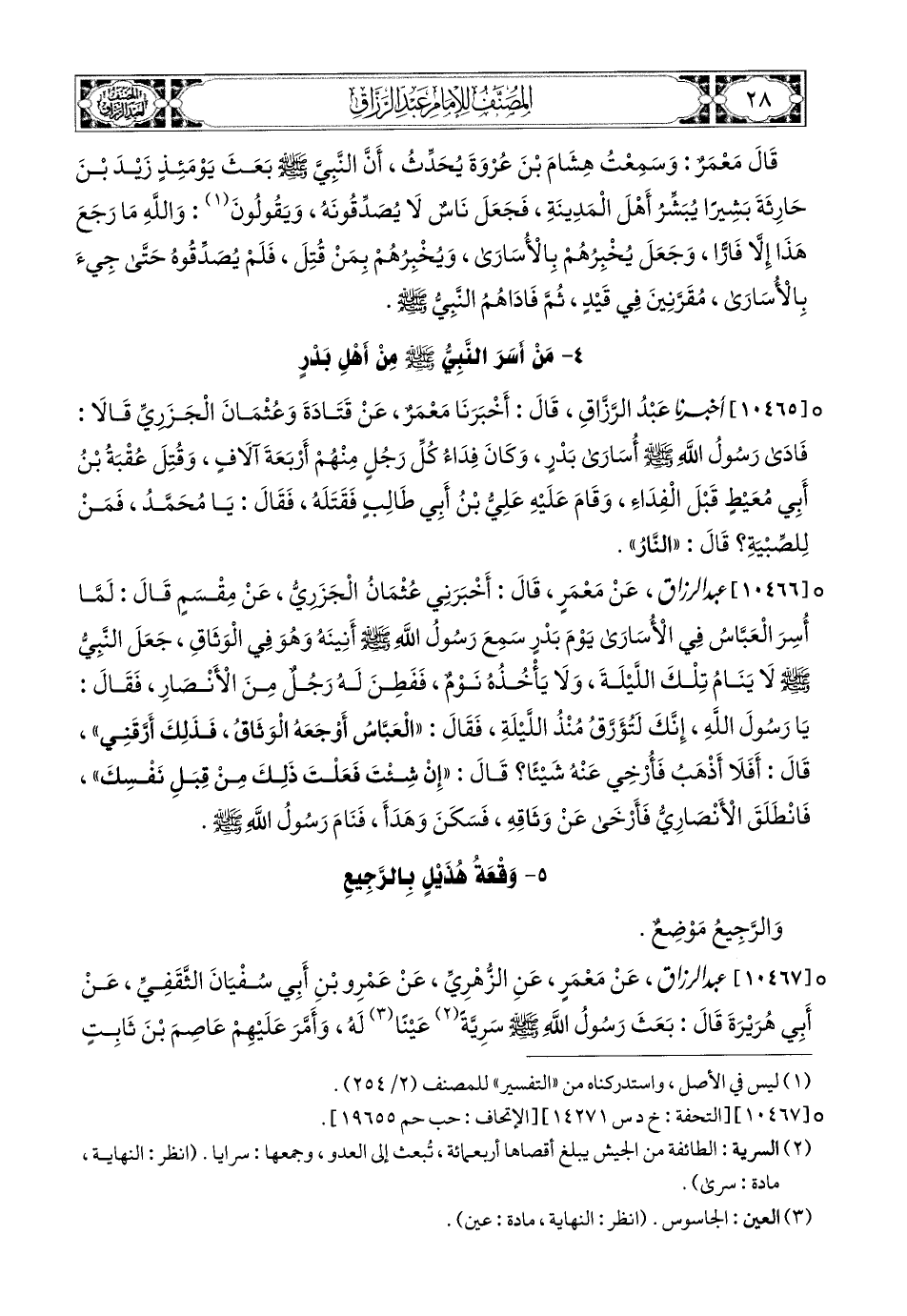 10467- عبد الرزاق، عَنْ مَعْمَرٍ، عَنِ الزُّهْرِيِّ، عَنْ عَمْرِو بنِ أَبِي سُفْيَانَ الثَّقَفِيِّ، عَنْ أَبِي هُرَيرَةَ، قَالَ: بَعَثَ رَسُولُ اللهِ صَلَّى اللهُ عَلَيْهِ وَسَلَّمَ سَرِيَّةً عَيْنًا لَهُ، وَأَمَّرَ عَلَيْهِمْ عَاصِمَ بن ثَابِتٍ، وَهُوَ جَدُّ عَاصِمِ بْنِ عُمَرَ، فَانْطَلَقُوا، حَتَّى إِذَا كَانُوا بِبَعْضِ الطَّرِيقِ بَيْنَ عُسْفَانَ وَمَكَّةَ نُزُولاً، فَذُكِرُوا لِحَيٍّ مِنْ هُذَيْلٍ، يُقَالُ لَهُمْ: بَنُو لِحْيَانَ، فَتَبِعُوهُمْ بِقَرِيبٍ مِنْ مِئَةِ رَجُلٍ رَامٍ، حَتَّى رَأَوْا آثَارَهُمْ، حَتَّى نَزَلُوا مَنْزِلاً يَرَوْنَهُ، فَوَجَدُوا فِيهِ نَوَى تَمْرٍ، يَرَوْنَهُ مِنْ تَمْرِ المَدِينَةِ، فَقَالُوا: هَذَا مِنْ تَمْرِ يَثْرِبَ،