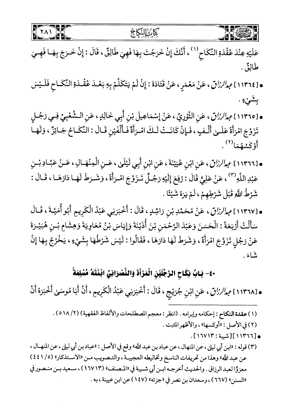 11367- عبد الرزاق، عَن مُحَمَّدِ بْنِ رَاشِدٍ، قَالَ: أَخْبَرَنِي عَبدُ الْكَرِيمِ أَبو أُمَيَّةَ، قَالَ: سَأَلْتُ أَرْبَعَةً: الْحَسَنَ، وَعَبْدَ الرَّحْمَنِ بن أُذَيْنَةَ، وَإِيَاسَ بن مُعَاوِيَةَ، وَهشَامَ بن هُبَيْرَةَ، عَن رَجُلٍ تَزَوَّجَ امْرَأَةً، وَشَرَطَ لَهَا دَارَهَا، فَقَالُوا: لَيْسَ شَرْطُهَا بِشَيْءٍ، يَخْرُجُ بِهَا إِنْ شَاءَ.