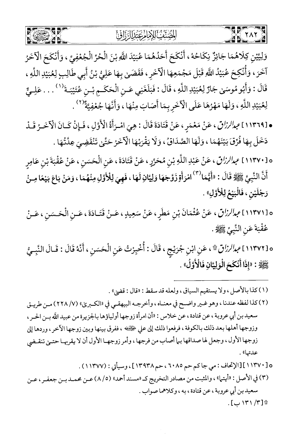 11372- عبد الرزاق، عَنِ ابْنِ جُرَيْجٍ، قَالَ: أُخْبِرْتُ عَنِ الْحَسَنِ، أَنَّهُ قَالَ: قَالَ النَّبِيُّ صَلَّى اللهُ عَلَيْهِ وَسَلَّمَ: إِذَا أَنْكَحَ الْوَلِيَّانِ فَالأَوَّلُ.