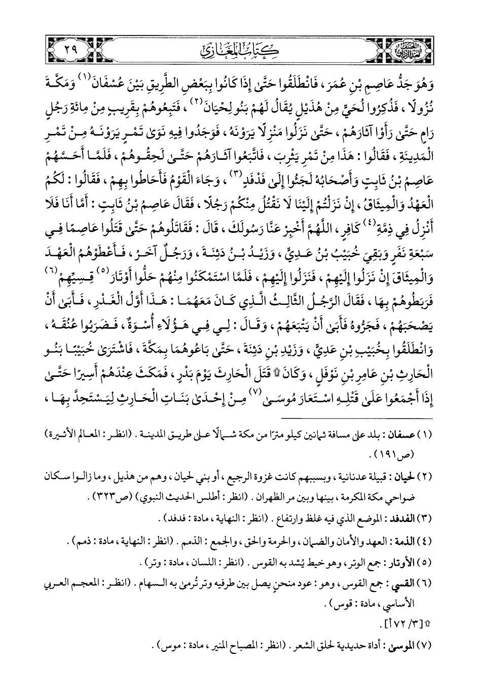 فَاتَّبَعُوا آثَارَهُمْ، حَتَّى لَحِقُوهُمْ، فَلَمَّا أَحَسَّهُمْ عَاصِمُ بن ثَابِتٍ وَأَصْحَابُهُ، لَجَأُوا إِلَى فَدْفَدٍ، وَجَاءَ الْقَوْمُ، فَأَحَاطُوا بِهِمْ، فَقَالُوا: لَكُمُ الْعَهْدُ وَالمِيثَاقُ، إِنْ نَزَلْتُمْ إِلَيْنَا لاَ نَقْتُلُ مِنْكُمْ رَجُلاً، فَقَالَ عَاصِمُ بن ثَابِتٍ: أَمَّا أَنَا فَلاَ أَنْزِلُ فِي ذِمَّةِ كَافِرٍ، اللهُمَّ أَخْبِرْ عَنَّا رَسُولَكَ، قَالَ: فَقَاتَلُوهُمْ، حَتَّى قَتَلُوا عَاصِمًا فِي سَبْعَةِ نَفَرٍ، وَبَقِيَ خُبَيْبُ بن عَدِيٍّ، وَزَيْدُ بن دَثِنَةَ، وَرَجُلٌ آخَرَ، فَأَعْطَوْهُمُ الْعَهْدَ وَالمِيثَاقَ إِنْ نَزَلُوا إِلَيْهِمْ، فَنَزَلُوا إِلَيْهِمْ، فَلَمَّا اسْتَمْكَنُوا مِنْهُمْ، حَلُّوا أَوْتَارَ قِسِيِّهِمْ، فَرَبَطُوهُمْ بِهَا، فَقَالَ الرَّجُلُ الثَّالِثُ الَّذِي كَانَ مَعَهُمَا: هَذَا أَوَّلُ الْغَدْرِ، فَأَبَى أَنْ يَصْحَبَهُمْ، فَجَرُّوهُ، فَأَبَى أَنْ يَتَّبِعَهُمْ، وَقَالَ: لِي فِي هَؤُلاَءِ أُسْوَةٌ، فَضَرَبُوا عُنُقَهُ، وَانْطَلَقُوا بِخُبَيْبِ بْنِ عَدِيٍّ، وَزَيْدِ بْنِ دَثِنَةَ، حَتَّى بَاعُوهُمَا بِمَكَّةَ، فَاشْتَرَى خُبَيْبًا بَنُو الْحَارِثِ بْنِ عَامِرِ بْنِ نَوْفَلٍ، وَكَانَ قَتَلَ الْحَارِثَ يَوْمَ بَدْرٍ، فَمَكَثَ عِنْدَهُمْ أَسِيرًا، حَتَّى إِذَا أَجْمَعُوا عَلَى قَتَلِهِ، اسْتَعَارَ مُوسَى مِنْ إِحْدَى بَنَاتِ الْحَارِثِ، لِيَسْتَحِدَّ بِهَا، فَأَعَارَتْهُ، قَالَتْ: فَغَفَلْتُ عَن صَبِيٍّ لِي، فَدَرَجَ إِلَيْهِ، حَتَّى أَتَاهُ، قَالَتْ: فَأَخَذَهُ، فَوَضَعَهُ عَلَى فَخِذِهِ، فَلَمَّا رَأَيْتُهُ، فَزِعْتُ فَزَعًا عَرَفَهُ فِيَّ، وَالمُوسَى بِيَدِهِ، قَالَ: أَتَخْشَيْنَ أَنْ أَقْتُلَهُ؟ مَا كُنْتُ لأَنْ أَفْعَلَ إِنْ شَاءَ اللهُ، قَالَ: فَكَانَتْ تَقُولُ: مَا رَأَيْتُ أَسِيرًا خَيْرًا مِنْ خُبَيْبٍ، لَقَدْ رَأَيْتُهُ يَأْكُلُ مِنْ قِطْفِ عِنَبٍ، وَمَا بِمَكَّةَ يَوْمَئِذٍ ثَمَرَةٌ، وَإِنَّهُ لَمُوثَقٌ فِي الْحَدِيدِ، وَمَا كَانَ إِلاَّ رِزْقًا رَزَقَهُ اللهُ إِيَّاهُ،