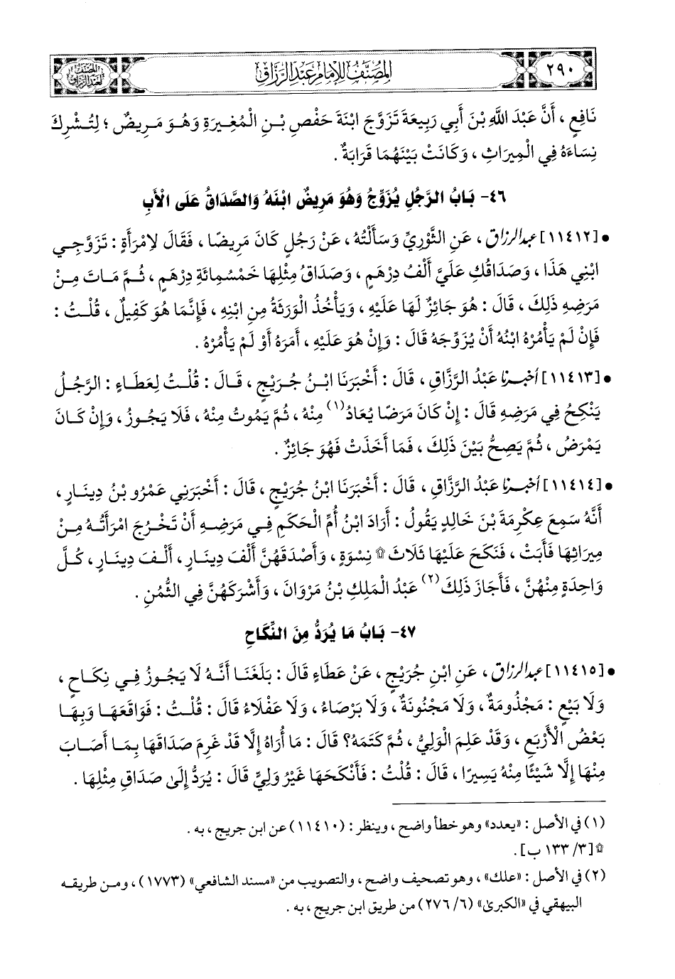 11414- أخبرنا عبد الرزاق، قال: أَخْبَرَنَا ابْنُ جُرَيْجٍ، قَالَ: أَخْبَرَنِي عَمْرُو بن دِينَارٍ، أَنَّهُ سَمِعَ عِكْرِمَةَ بن خَالِدٍ يَقُولُ: أَرَادَ ابْنُ أُمِّ الْحَكَمِ فِي مَرَضِهِ أَنْ تَخْرُجَ امْرَأَتُهُ مِنْ مِيرَاثِهَا، فَأَبَتْ، فَنَكَحَ عَلَيْهَا ثَلاَثَ نِسْوَةٍ، وَأَصْدَقَهُنَّ أَلْفَ دِينَارٍ، أَلْفَ دِينَارٍ، كُلَّ وَاحِدَةٍ مِنْهُنَّ، فَأَجَازَ ذَلِكَ عَبدُ المَلِكِ بن مَرْوَانَ، وَأَشْرَكَهُنَّ فِي الثُّمُنِ.