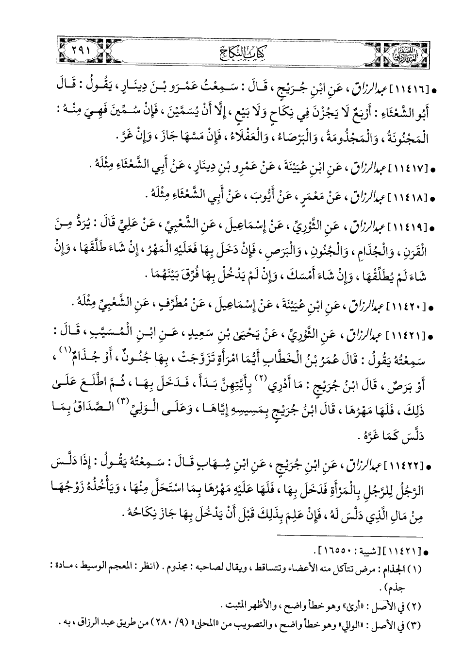 11416- عبد الرزاق، عَنِ ابْنِ جُرَيْجٍ، قَالَ: سَمِعْتُ عَمْرَو بن دِينَارٍ يَقُولُ: قَالَ أَبو الشَّعْثَاءِ: أَرْبَعٌ لاَ يَجُزْنَ فِي نِكَاحٍ وَلاَ بَيْعٍ، إِلاَّ أَنْ يُسَمَّيْنَ، فَإِنْ سُمِّينَ فَهِيَ مِنْهُ: المَجْنُونَةُ، وَالمَجْذُومَةُ، وَالْبَرْصَاءُ، وَالْعَفْلاَءُ، فَإِنْ مَسَّهَا جَازَ، وَإِنْ غَرَّ.