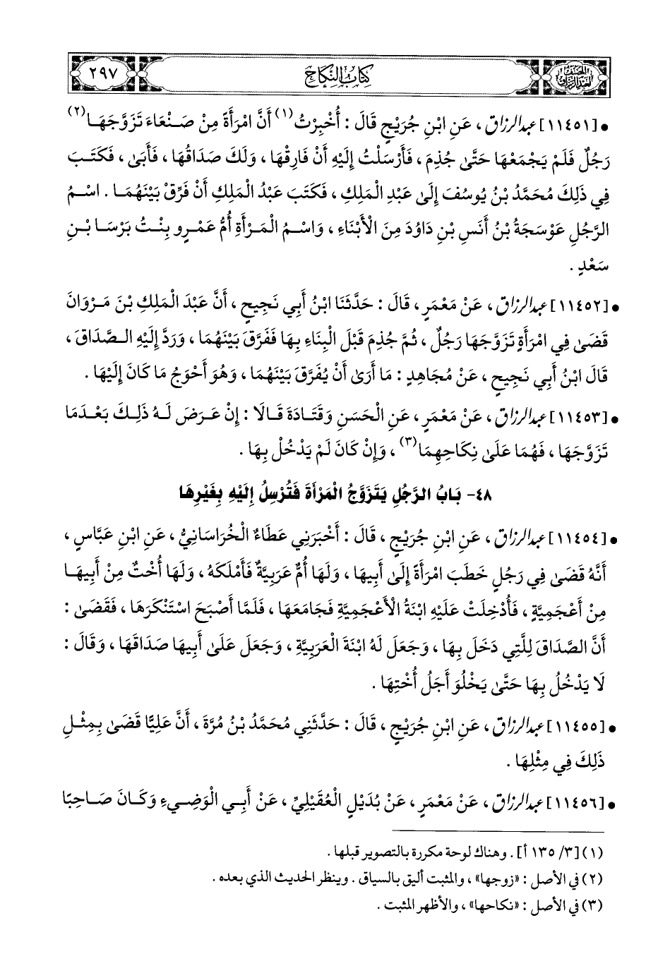 11451- عبد الرزاق، عَنِ ابْنِ جُرَيْجٍ، قَالَ: أُخْبِرْتُ أَنَّ امْرَأَةً مِنْ صَنْعَاءَ تَزَوَّجَهَا رَجُلٌ فَلَمْ يَجْمَعْهَا حَتَّى جُذِمَ، فَأَرْسَلْتُ إِلَيْهِ أَنْ فَارِقْهَا، وَلَكَ صَدَاقُهَا، فَأَبَى، فَكَتَبَ فِي ذَلِكَ مُحَمَّدُ بن يُوسُفَ إِلَى عَبدِ المَلِكِ، فَكَتَبَ عَبدُ المَلَكِ: أَنْ فَرِّقْ بَيْنَهُمَا، اسْمُ الرَّجُلِ: عَوْسَجَةُ بن أَنَسِ بْنِ دَاوُدَ مِنَ الأَبْنَاءِ، وَاسْمُ المَرْأَةِ أُمُّ عَمْرٍو بِنْتِ بَرْسَا بنِ سَعْدٍ.