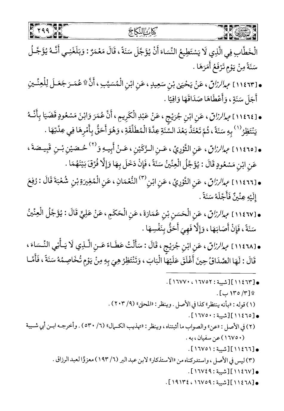 11466 - عبد الرزاق، عَنِ الثَّورِيِّ، عَنِ ابْنِ (1) النُّعْمَانِ، عَنِ المُغِيرَةِ بْنِ شُعْبَةَ، قَالَ: رُفِعَ إِلَيْهِ عِنِّينٌ، فَأَجَّلَهُ سَنَةً.