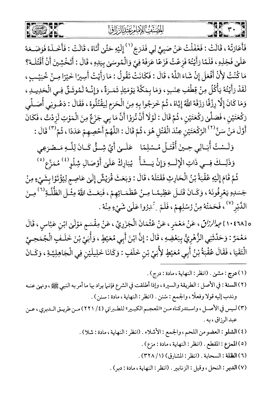 10468- عبد الرزاق، عَنْ مَعْمَرٍ، عَن عُثْمَانَ الْجَزَرِيِّ، عَن مِقْسَمٍ، مَوْلَى ابْنِ عَبَّاسٍ، قَالَ مَعْمَرٌ: وَحَدَّثَنِي الزُّهْرِيُّ بِبَعْضِهِ، قَالَ: إِنَّ ابْنَ أَبِي مُعَيْطٍ، وَأُبَيَّ بن خَلَفٍ الْجُمَحِيَّ الْتَقَيَا، فَقَالَ عُقْبَةُ بن أَبِي مُعَيْطٍ لأُبَيِّ بْنِ خَلَفٍ، وَكَانَا خَلِيلَيْنِ فِي الْجَاهِلِيَّةِ، وَكَانَ أُبَيُّ بن خَلْفٍ أَتَى النَّبِيَّ صَلَّى اللهُ عَلَيْهِ وَسَلَّمَ، فَعَرَضَ عَلَيْهِ الإِسْلاَمَ، فَلَمَّا سَمِعَ ذَلِكَ عُقْبَةُ، قَالَ: لاَ أَرْضَى عَنْكَ، حَتَّى تَأْتِيَ مُحَمَّدًا، فَتَتْفُلَ فِي وَجْهِهِ، وَتَشْتُمَهُ، وَتُكَذِّبَهُ، قَالَ: فَلَمْ يُسَلِّطْهُ اللهُ عَلَى ذَلِكَ، فَلَمَّا كَانَ يَوْمُ بَدْرٍ، أُسِرَ عُقْبَةُ بن أَبِي مُعَيْطٍ فِي الأُسَارَى، فَأَمَرَ النَّبِيُّ صَلَّى اللهُ عَلَيْهِ وَسَلَّمَ عَلِيَّ بن أَبِي طَالِبٍ أَنْ يَقْتُلَهُ، فَقَالَ عُقْبَةُ: يَا مُحَمَّدُ، مِنْ بَيْنَ هَؤُلاَءِ أُقْتَلُ؟ قَالَ: نَعَمْ، قَالَ: لِمَ؟ قَالَ: بِكُفْرِكَ، وَفُجُورِكَ، وَعُتُوِّكَ عَلَى اللهِ وَرَسُولِهِ.