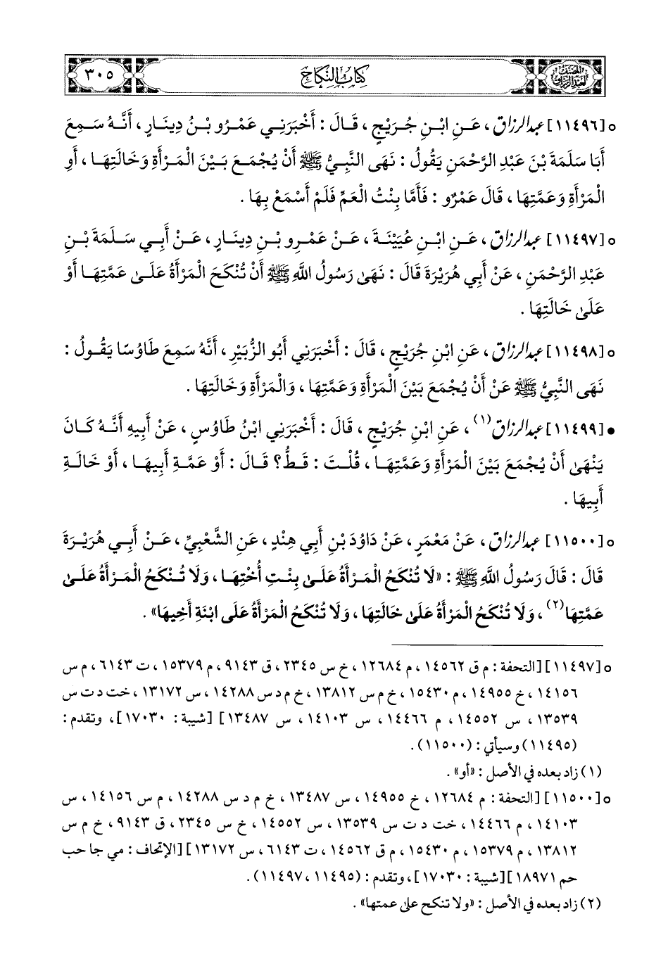 11500 - عبد الرزاق، عَنْ مَعْمَرٍ، عَن دَاوُدَ بْنِ أَبِي هِنْدَ، عَنِ الشَّعْبِيِّ، عَنْ أَبِي هُرَيرَةَ، قَالَ: قَالَ رَسُولُ اللهِ صَلَّى اللهُ عَلَيْهِ وَسَلَّمَ: لاَ تُنْكَحُ المَرْأَةُ عَلَى بِنْتِ أُخْتِهَا، وَلاَ تُنْكَحُ المَرْأَةُ عَلَى عَمَّتِهَا، وَلاَ تُنْكَحُ المَرْأَةُ عَلَى خَالَتِهَا، وَلاَ تُنْكَحُ المَرْأَةُ عَلَى ابْنَةِ (1) أَخِيهَا.