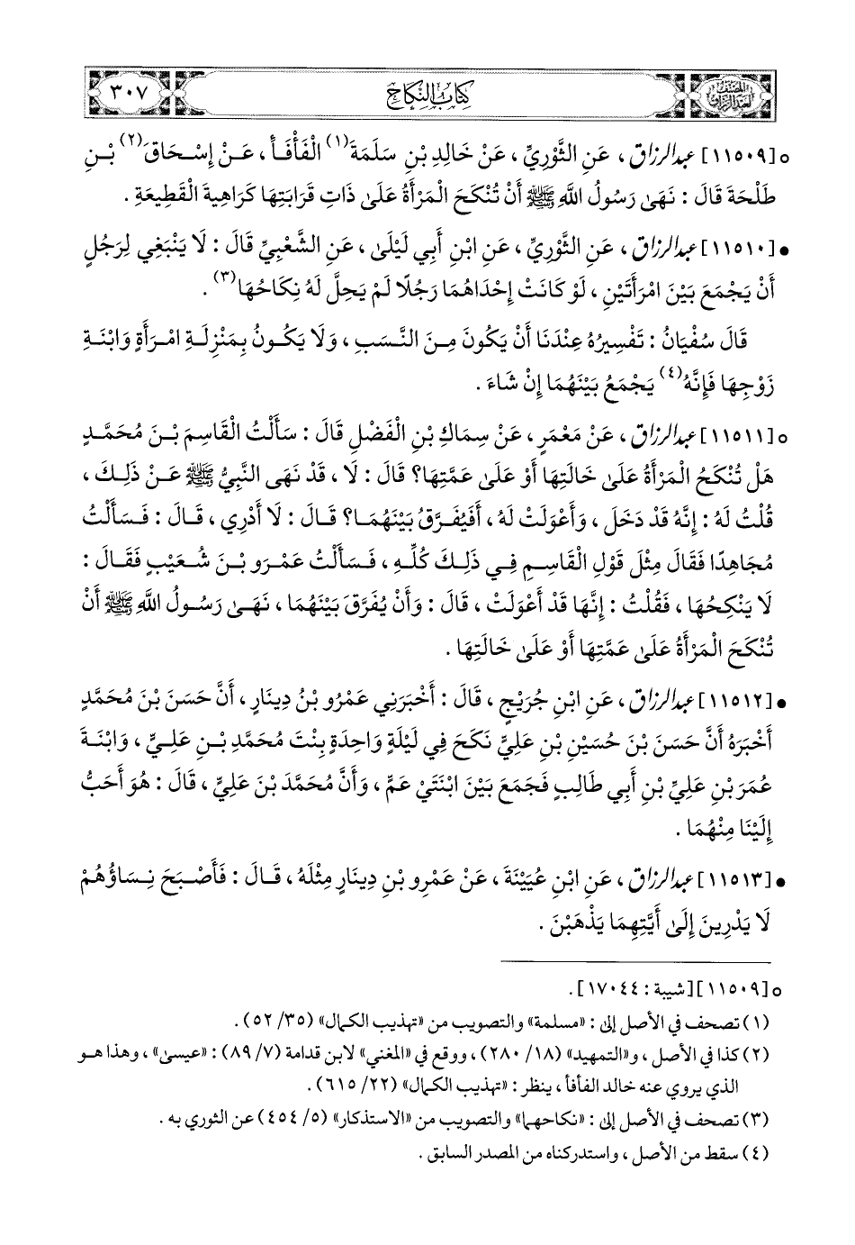 11511- عبد الرزاق، عَنْ مَعْمَرٍ، عَن سِمَاكِ بْنِ الْفَضْلِ، قَالَ: سَأَلْتُ الْقَاسِمَ بن مُحَمَّدٍ: هَلْ تُنْكَحُ المَرْأَةُ عَلَى خَالَتِهَا، أَوْ عَلَى عَمَّتِهَا؟ قَالَ: لاَ، قَدْ نَهَى النَّبِيُّ صَلَّى اللهُ عَلَيْهِ وَسَلَّمَ عَن ذَلِكَ، قُلْتُ لَهُ: إِنَّهُ قَدْ دَخَلَ، وَأَعْوَلَتْ لَهُ، أَفَيُفَرَّقُ بَيْنَهُمَا؟ قَالَ: لاَ أَدْرِي، قَالَ: فَسَأَلْتُ مُجاهِدًا، فَقَالَ مِثْلَ قَوْلِ الْقَاسِمِ فِي ذَلِكَ كُلِّهِ، فَسَأَلْتُ عَمْرَو بن شُعَيْبٍ، فَقَالَ: لاَ يَنْكِحُهَا، فَقُلْتُ: إِنَّهَا قَدْ أَعْوَلَتْ، قَالَ: وَأَنْ يُفَرَّقَ بَيْنَهُمَا، نَهَى رَسُولُ اللهِ صَلَّى اللهُ عَلَيْهِ وَسَلَّمَ أَنْ تُنْكَحَ المَرْأَةُ عَلَى عَمَّتِهَا، أَوْ عَلَى خَالَتِهَا.