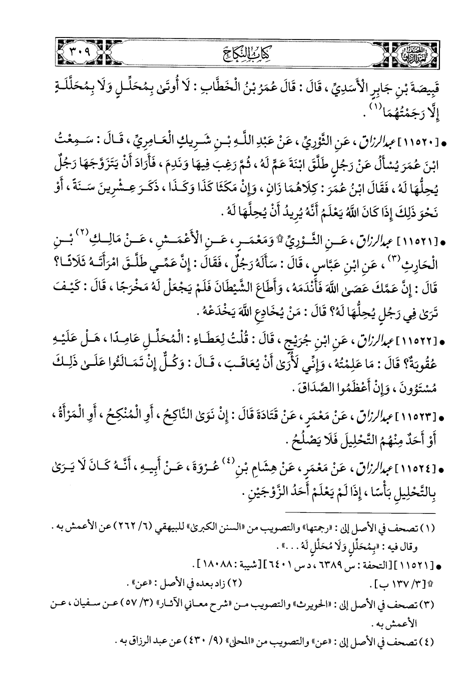 11522- عبد الرزاق، عَنِ ابْنِ جُرَيْجٍ، قَالَ: قُلْتُ لِعَطَاءٍ: المُحَلِّلِ عَامِدًا، هَلْ عَلَيْهِ عُقُوبَةٌ؟ قَالَ: مَا عَلِمْتُهُ، وَإِنِّي لأَرَى أَنْ يُعَاقَبَ، قَالَ: وَكُلٌّ إِنْ تَمَالَئُوا عَلَى ذَلِكَ مُسْتَوُونَ وَإِنْ أَعْظَمُوا الصَّدَاقَ.