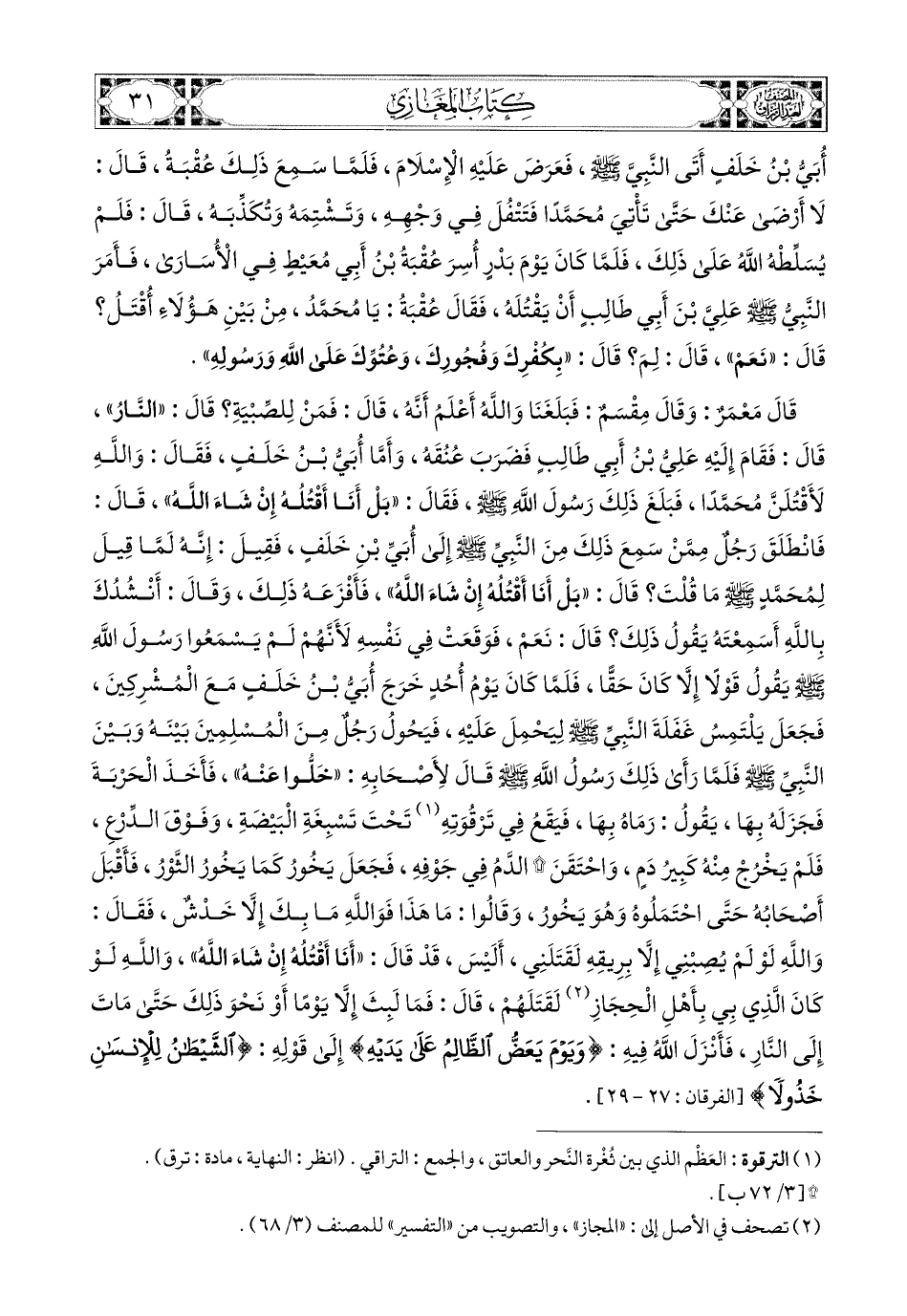 فَلَمَّا رَأَى ذَلِكَ رَسُولُ اللهِ صَلَّى اللهُ عَلَيْهِ وَسَلَّمَ، قَالَ لأَصْحَابِهِ: خَلُّوا عَنْهُ، فَأَخَذَ الْحَرْبَةَ، فَجَزَلَهُ بِهَا، يَقُولُ: رَمَاهُ بِهَا، فَيَقَعُ فِي تَرْقُوَتِهِ، تَحْتَ تَسْبِغَةِ الْبَيْضَةِ، وَفَوْقَ الدِّرْعِ، فَلَمْ يَخْرُجْ مِنْهُ كَبِيرُ دَمٍ، وَاحْتَقَنَ الدَّمُ فِي جَوْفِهِ، فَجَعَلَ يَخُورُ كَمَا يَخُورُ الثَّوْرُ، فَأَقْبَلَ أَصْحَابُهُ، حَتَّى احْتَمَلُوهُ وَهُوَ يَخُورُ، وَقَالُوا: مَا هَذَا؟ فَوَاللهِ مَا بِكَ إِلاَّ خَدْشٌ، فَقَالَ: وَاللهِ لَوْ لَمْ يُصِبْنِي إِلاَّ بِرِيقِهِ لَقَتَلَنِي، أَلَيْسَ قَدْ قَالَ: أَنَا أَقْتُلُهُ، إِنْ شَاءَ اللهُ، وَاللهِ لَوْ كَانَ الَّذِي بِي بِأَهْلِ الْحِجَازِ لَقَتَلَهُمْ، قَالَ: فَمَا لَبِثَ إِلاَّ يَوْمًا، أَوْ نَحْوَ ذَلِكَ، حَتَّى مَاتَ إِلَى النَّارِ، فَأَنْزَلَ اللهُ فِيهِ: {وَيَوْمَ يَعَضُّ الظَّالِمُ عَلَى يَدَيْهِ} إِلَى قَوْلِهِ: {الشَّيْطَانُ لِلإِنْسَانِ خَذُولاً}.