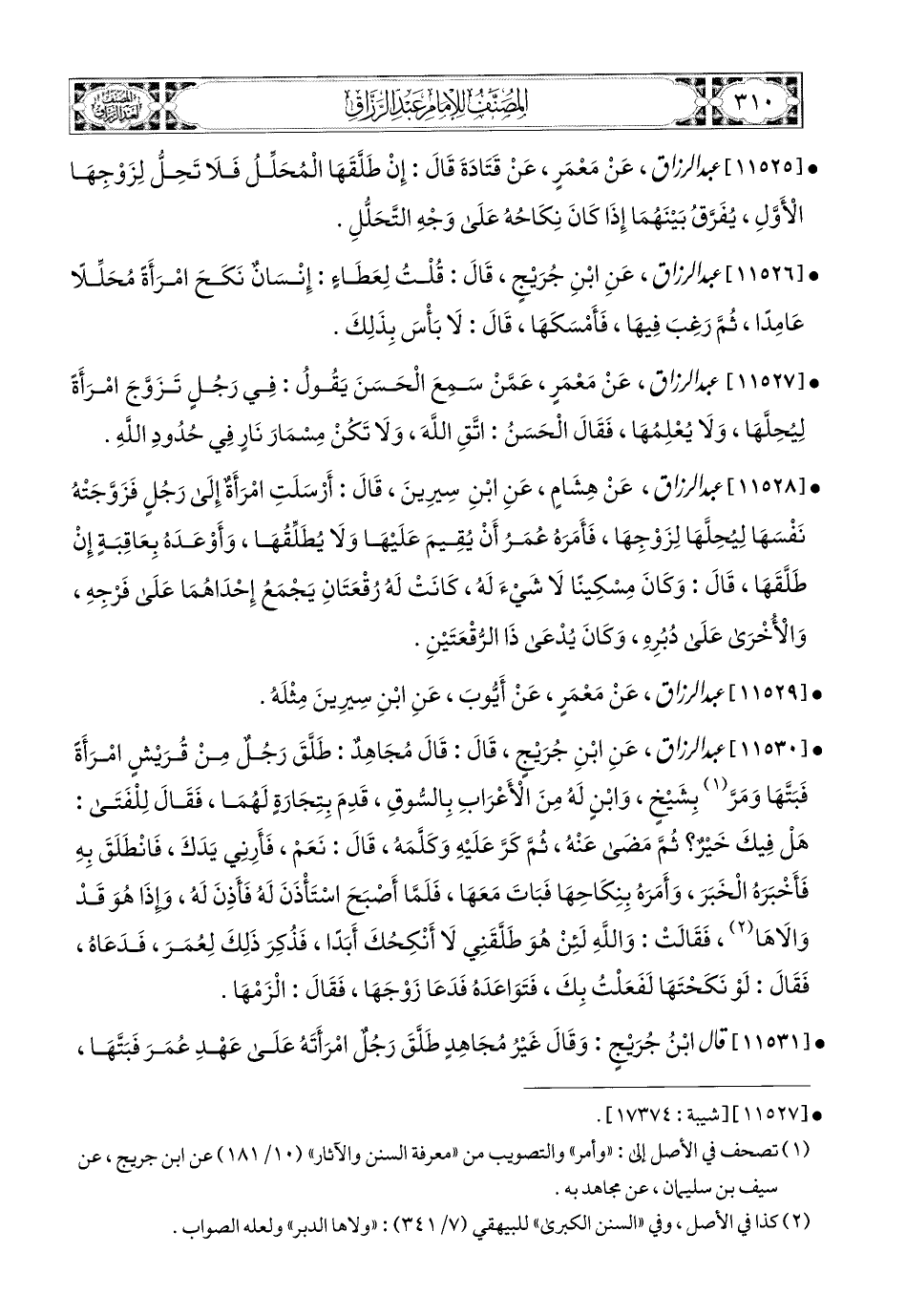 11528- عبد الرزاق، عَن هِشَامٍ، عَنِ ابْنِ سِيرِينَ، قَالَ: أَرْسَلَتِ امْرَأَةٌ إِلَى رَجُلٍ، فَزَوَّجَتْهُ نَفْسَهَا، لِيُحِلَّهَا لِزَوْجِهَا، فَأَمَرَهُ عُمَرُ أَنْ يُقِيمَ عَلَيْهَا وَلاَ يُطَلِّقَهَا، وَأَوْعَدَهُ بِعَاقِبَةٍ إِنْ طَلَّقَهَا، قَالَ: وَكَانَ مِسْكِينًا لاَ شَيْءَ لَهُ، كَانَتْ لَهُ رُقْعَتَانِ يَجْمَعُ إِحْدَاهُمَا عَلَى فَرْجِهِ، وَالأُخْرَى عَلَى دُبُرِهِ، وَكَانَ يُدْعَى ذَا الرُّقْعَتَيْنِ.
