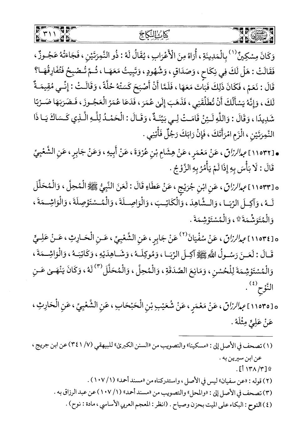 11534 - عبد الرزاق، عَنْ سُفْيَانَ (1)، عَن جَابِرٍ، عَنِ الشَّعْبِيِّ، عَنِ الْحَارِثِ، عَنْ عَلِيٍّ، قَالَ: لَعَنَ رَسُولُ اللهِ صَلَّى اللهُ عَلَيْهِ وَسَلَّمَ آكِلَ الرِّبَا، وَمُوكِلَهُ، وَشَاهِدَيْهِ، وَكَاتِبَهُ، وَالْوَاشِمَةَ، وَالمُسْتَوْشِمَةَ لِلْحُسْنِ، وَمَانِعَ الصَّدَقَةِ، وَالمُحِلَّ، وَالمُحَلَّلَ لَهُ، وَكَانَ يَنْهَى عَنِ النَّوْحِ.