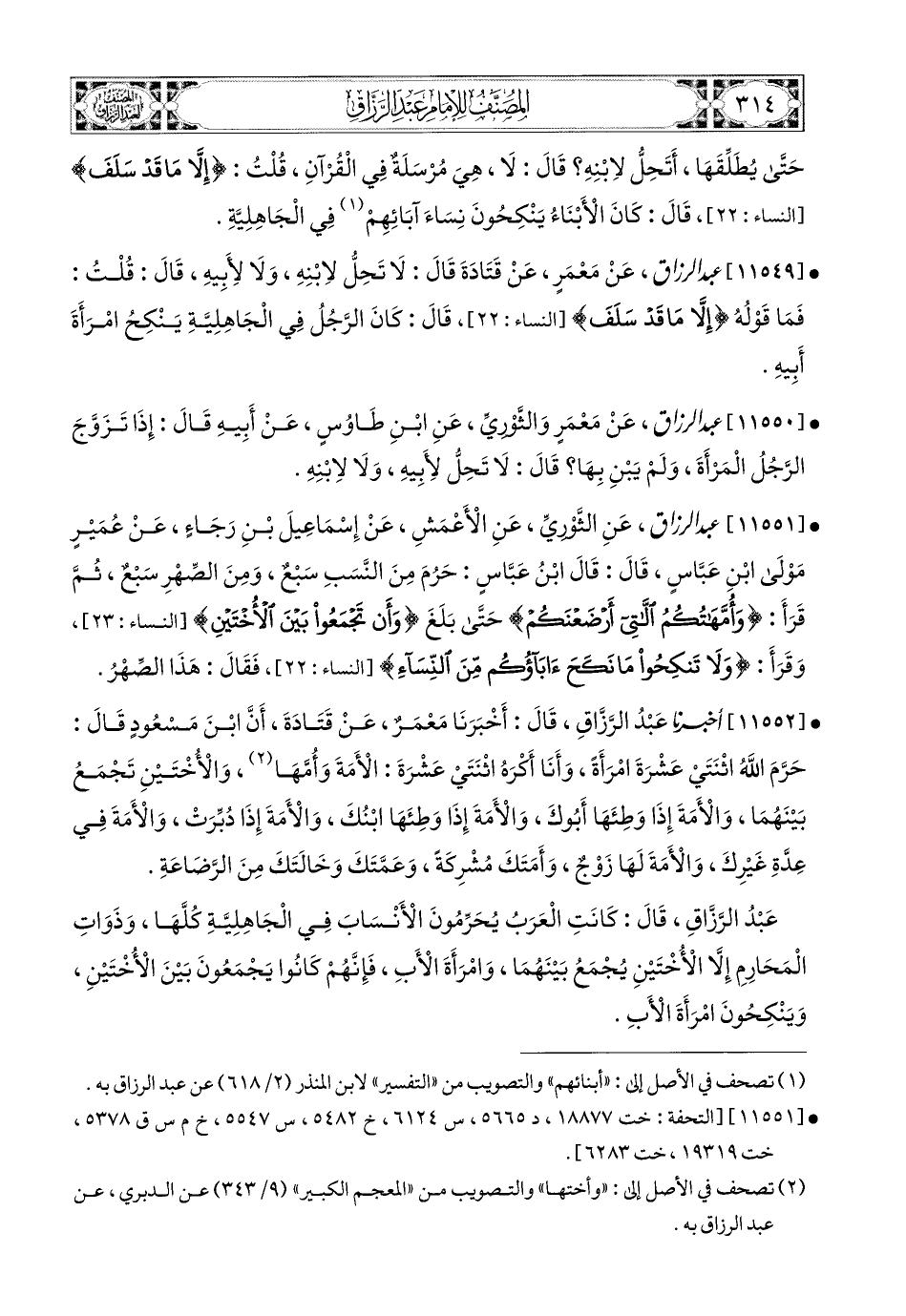 10810- عبد الرزاق، قَالَ: كَانَتِ الْعَرَبُ يُحَرِّمُونَ الأَنْسَابَ فِي الْجَاهِلِيَّةِ كُلِّهَا، وَذَوَاتِ المَحَارِمِ، إِلاَّ الأُخْتَيْنِ يُجْمَعُ بَيْنَهُمَا، وَامْرَأَةَ الأَبِ، فَإِنَّهُمْ كَانُوا يَجْمَعُونَ بَيْنَ الأُخْتَيْنِ، وَيَنْكِحُونَ امْرَأَةَ الأَبِ.