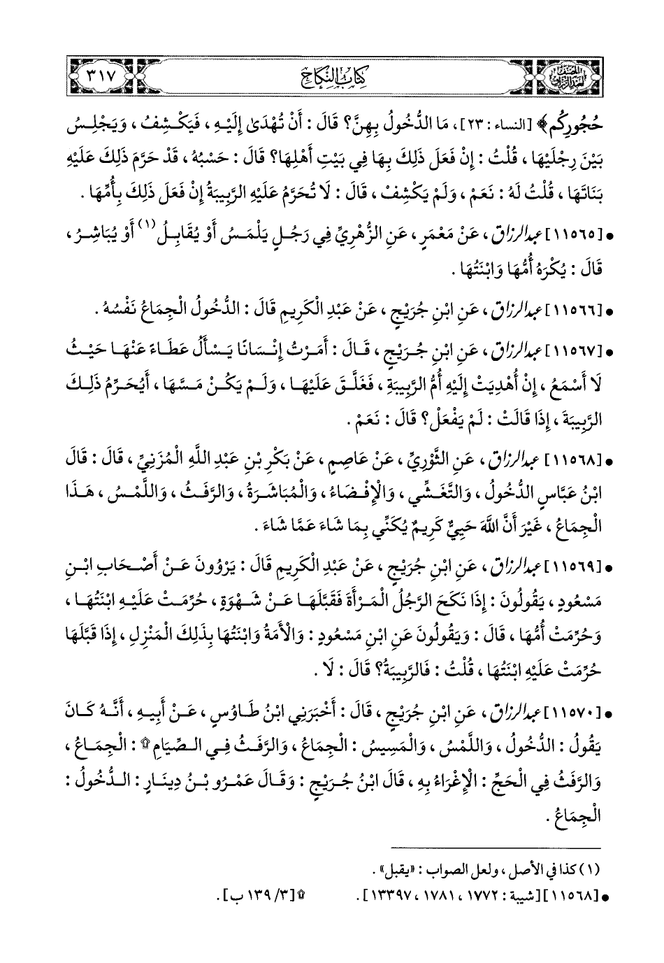 11569- عبد الرزاق، عَنِ ابْنِ جُرَيْجٍ، عَنْ عَبدِ الْكَرِيمِ، قَالَ: يَرْوُونَ عَنْ أَصْحَابِ ابْنِ مَسْعُودٍ، يَقُولُونَ: إِذَا نَكَحَ الرَّجُلُ المَرْأَةَ فَقَبَّلَهَا عَن شَهْوَةٍ، حُرِّمَتْ عَلَيْهِ ابْنَتُهَا، وَحُرِّمَتْ أُمُّهَا. قَالَ: وَيَقُولُونَ عَنِ ابْنِ مَسْعُودٍ: وَالأَمَةُ وَابْنَتُهَا بِذَلِكَ المَنْزِلِ، إِذَا قَبَّلَهَا حُرِّمَتْ عَلَيْهِ ابْنَتُهَا، قُلْتُ: فَالرَّبِيبَةُ؟ قَالَ: لاَ.