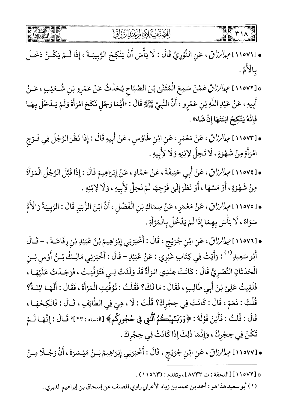 11576 - عبد الرزاق، عَنِ ابْنِ جُرَيْجٍ، قَالَ: أَخْبَرَنِي إِبرَاهِيمُ بن عُبَيْدِ بْنِ رِفَاعَةَ، قَالَ أَبو سَعيدٍ: رَأَيْتُ فِي كِتَابِ غَيْرِي، عَنْ (1) عُبَيدٍ، قَالَ: أَخْبَرَنِي مَالِكُ بن أَوْسِ بْنِ الْحَدَثَانِ النَّصْرِيُّ، قَالَ: كَانَتْ عِنْدِي (2) امْرَأَةٌ قَدْ وَلَدَتْ لِي فَتُوفِّيتْ، فَوَجَدْتُ عَلَيْهَا، فَلَقِيتُ عَلِيَّ بن أَبِي طَالِبٍ، فَقَالَ: مَا لَكَ؟ فَقُلْتُ: تُوُفِّيَتِ المَرْأَةُ، فَقَالَ: أَلَهَا ابْنَةٌ؟ قُلْتُ: نَعَمْ، قَالَ: كَانَتْ فِي حِجْرِكَ؟ قُلْتُ: لاَ، هِيَ فِي الطَّائِفِ، قَالَ: فَانْكِحْهَا، قَالَ: قُلْتُ: فَأَيْنَ قَوْلُهُ: {وَرَبَائِبُكُمُ اللاَّتِي فِي حُجُورِكُمْ}؟ قَالَ: إِنَّهَا لَمْ تَكُنْ فِي حِجْرِكَ، وَإِنَّمَا ذَلِكَ إِذَا كَانَتْ فِي حِجْرِكَ.