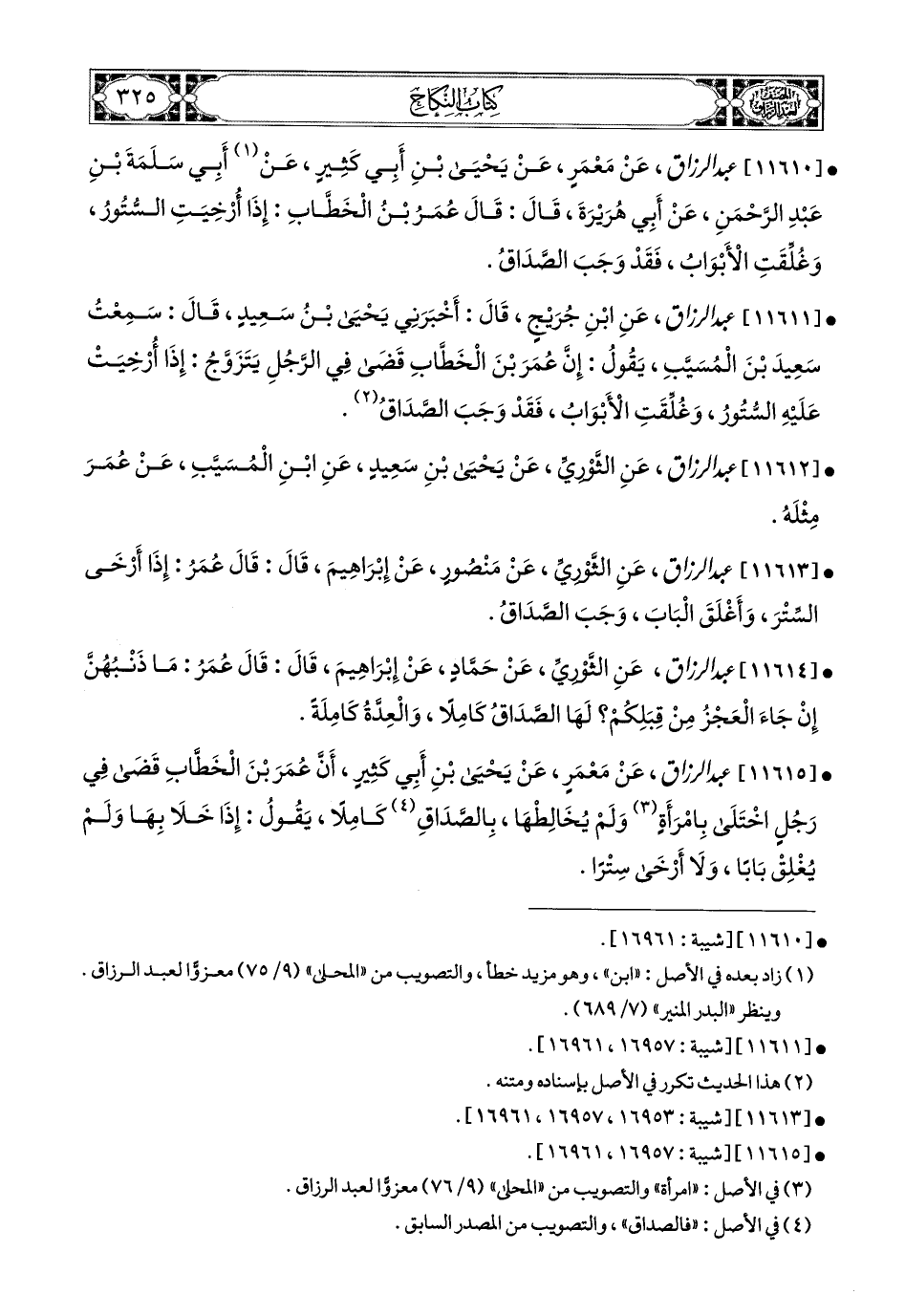 11610- عبد الرزاق، عَنْ مَعْمَرٍ، عَن يَحيَى بنِ أَبِي كَثِيرٍ، عَنْ أَبِي سَلَمَةَ بْنِ عَبدِ الرَّحْمَنِ، عَنْ أَبِي هُرَيرَةَ، قَالَ: قَالَ عُمَرُ بن الْخَطَّابِ: إِذَا أُرْخِيَتِ السُّتُورُ، وَغُلِّقَتِ الأَبْوَابُ، فَقَدْ وَجَبَ الصَّدَاقُ.