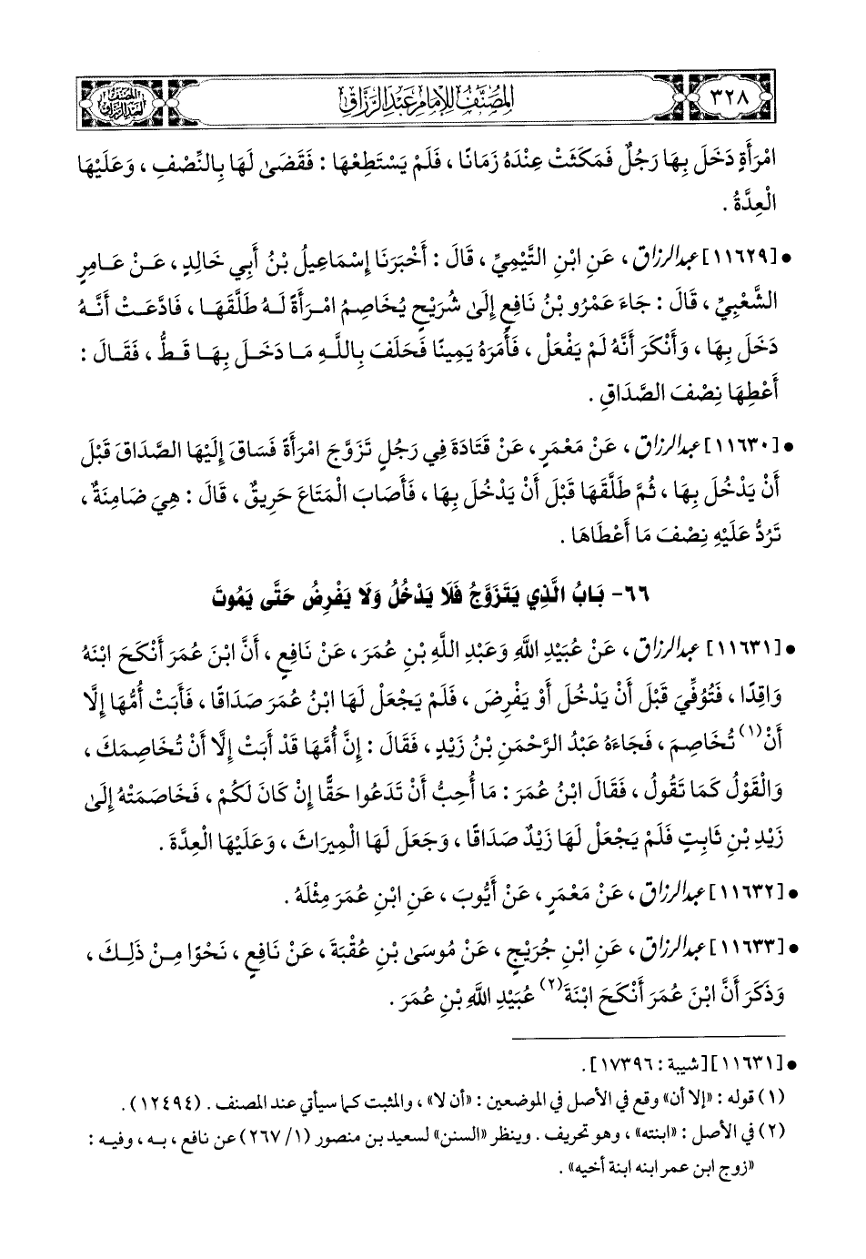 11631- عبد الرزاق، عَن عُبَيْدِ اللهِ، وَعَبْدِ اللهِ بن عُمَرَ، عَن نَافِعٍ، أَنَّ ابْنَ عُمَرَ أَنْكَحَ ابْنَهُ وَاقِدًا، فَتُوُفِّيَ قَبْلَ أَنْ يَدْخُلَ، أَوْ يَفْرِضَ، فَلَمْ يَجْعَلْ لَهَا ابْنُ عُمَرَ صَدَاقًا، فَأَبَتْ أُمُّهَا، إِلاَّ أَنْ تُخَاصِمَ، فَجَاءَهُ عَبدُ الرَّحْمَنِ بن زَيْدٍ، فَقَالَ: إِنَّ أُمَّهَا قَدْ أَبَتْ إِلاَّ أَنْ تُخَاصِمَكَ، وَالْقَوْلُ كَمَا تَقُولُ، فَقَالَ ابْنُ عُمَرَ: مَا أُحِبُّ أَنْ تَدَعُوا حَقًّا إِنْ كَانَ لَكُمْ، فَخَاصَمَتْهُ إِلَى زَيْدِ بْنِ ثَابِتٍ، فَلَمْ يَجْعَلْ لَهَا زَيْدٌ صَدَاقًا، وَجَعَلَ لَهَا المِيرَاثَ، وَعَلَيْهَا الْعِدَّةُ.