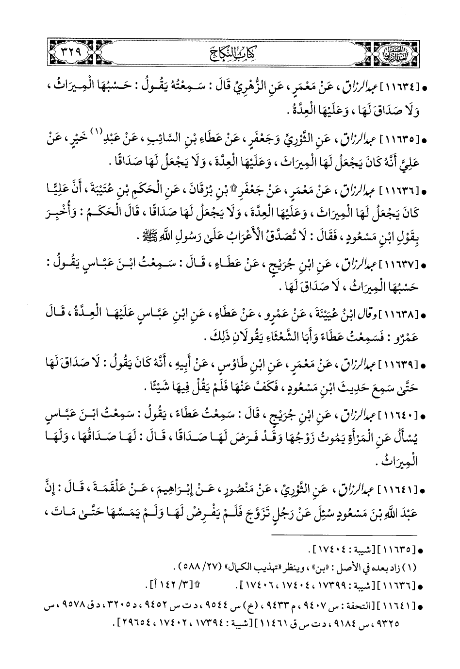 11641 - عبد الرزاق، عَنِ الثَّورِيِّ، عَنْ مَنصُورٍ، عَن إِبرَاهِيمَ، عَنْ عَلْقَمَةَ، قَالَ: إِنَّ عَبدُ اللهِ بن مَسْعُودٍ سُئِلَ (1) عَن رَجُلٍ تَزَوَّجَ فَلَمْ يَفْرِضْ لَهَا وَلَمْ يَمَسَّهَا، حَتَّى مَاتَ، فَرَدَّدَهُمْ (2)، ثُمَّ قَالَ: إِنِّي أَقُولُ فِيهَا بِرَائِي (3)، فَإِنْ كَانَ صَوَابًا فَمِنَ اللهِ، وَإِنْ كَانَ خَطَأً فَمِنِّي، أَرَى لَهَا صَدَاقَ امْرَأَةٍ مِنْ نِسَائِهَا، وَلاَ وَكْسَ، وَلاَ شَطَطَ، وَعَلَيْهَا الْعِدَّةُ، وَلَهَا المِيرَاثُ، فَقَامَ مَعْقِلُ بن سِنَانٍ الأَشْجَعِيُّ، فَقَالَ: أَشْهَدُ لَقَضَيْتَ فِيهَا بِقَضَاءِ رَسُولِ اللهِ صَلَّى اللهُ عَلَيْهِ وَسَلَّمَ فِي بِرْوَعَ ابْنَةِ (4) وَاشِقٍ، امْرَأَةٍ مِنْ بَنِي رُؤَاسٍ، مِنْ بَنِي عَامِرِ بْنِ رُؤَاسِ بْنِ صَعْصَعَةَ.