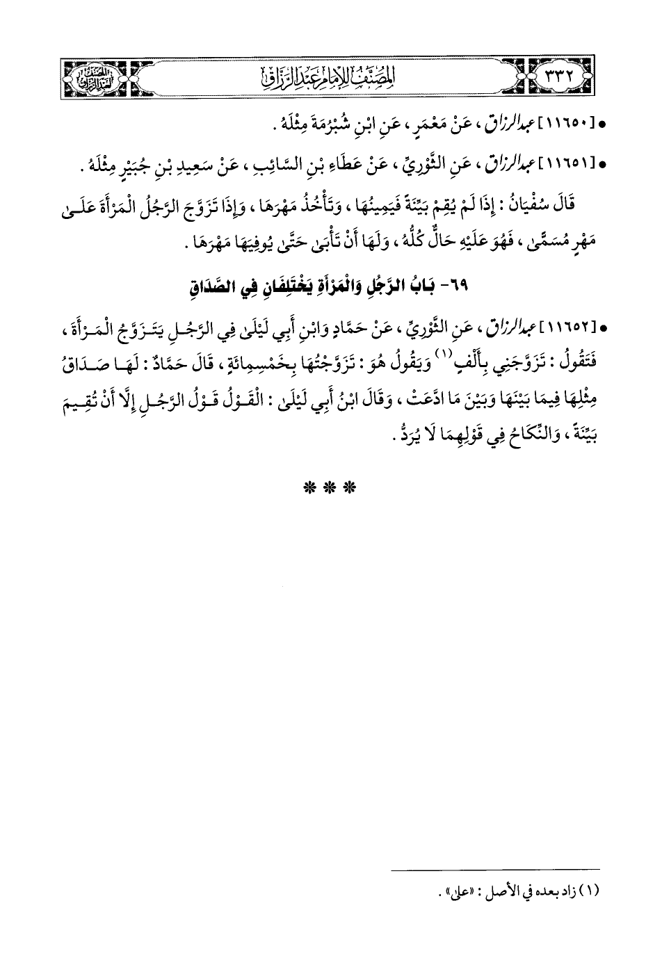11652- عبد الرزاق، عَنِ الثَّورِيِّ، عَن حَمَّادٍ، وَابْنِ أَبِي لَيْلَى، فِي الرَّجُلِ يَتَزَوَّجُ المَرْأَةَ، فَتَقُولُ: تَزَوَّجَنِي بِأَلْفٍ، وَيَقُولُ هُوَ: تَزَوَّجْتُهَا بِخَمْسِ مِئَةٍ، قَالَ حَمَّادٌ: لَهَا صَدَاقُ مِثْلِهَا، فِيمَا بَيْنَهَا وَبَيْنَ مَا ادَّعَتْ، وَقَالَ ابْنُ أَبِي لَيْلَى: الْقَوْلُ قَوْلُ الرَّجُلِ إِلاَّ أَنْ تُقِيمَ بَيِّنَةً، وَالنِّكَاحُ فِي قَوْلِهِمَا لاَ يُرَدُّ.