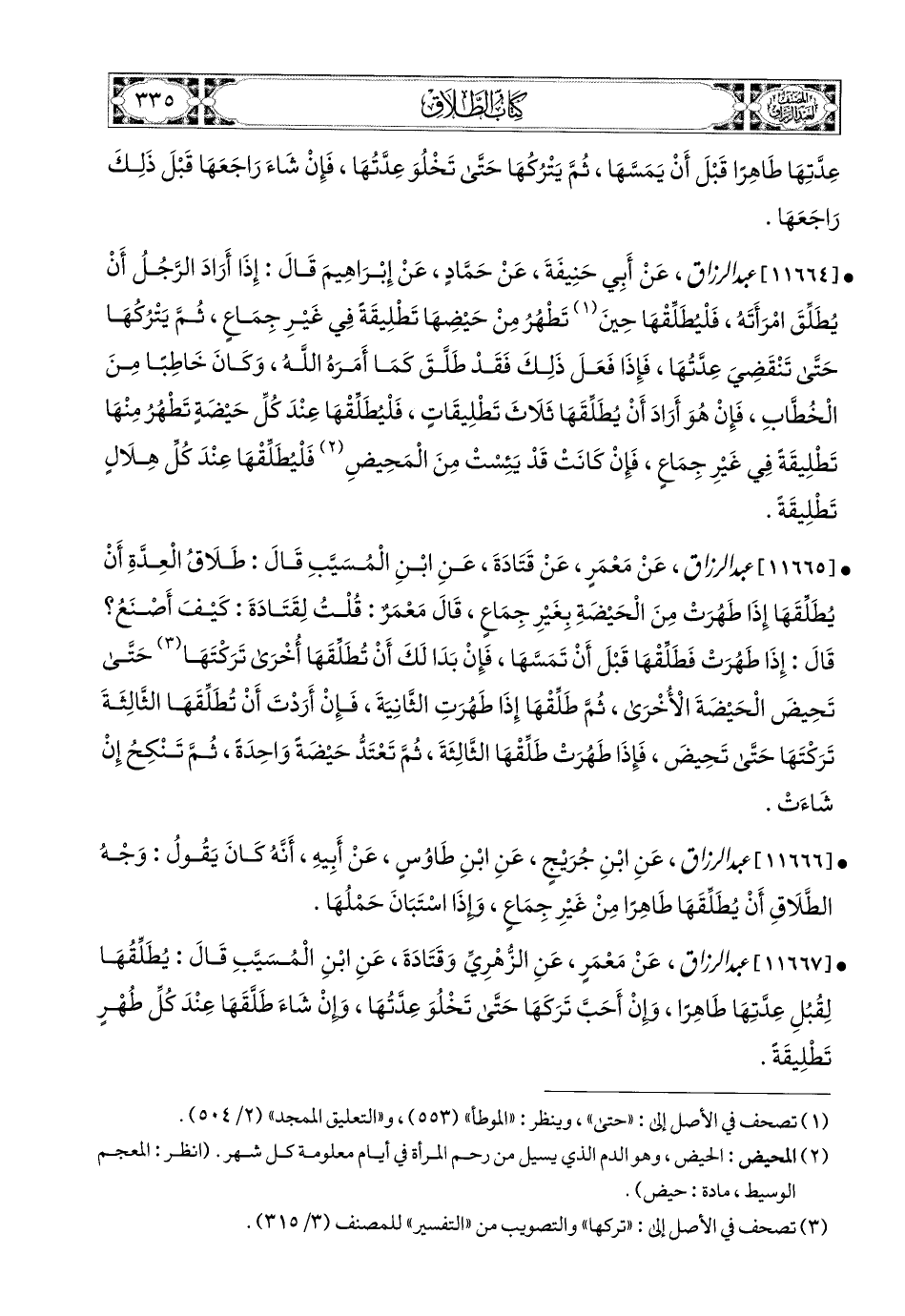 11667- عبد الرزاق، عَنْ مَعْمَرٍ، عَنِ الزُّهْرِيِّ، وَقَتَادَةَ، عَنِ ابْنِ المُسَيَّبِ، قَالَ: يُطَلِّقُهَا لِقُبُلِ عِدَّتِهَا طَاهِرًا، وَإِنْ أَحَبَّ تَرَكَهَا حَتَّى تَخْلُوَ عِدَّتُهَا، وَإِنْ شَاءَ طَلَّقَهَا عِنْدَ كُلِّ طُهْرٍ تَطْلِيقَةً.