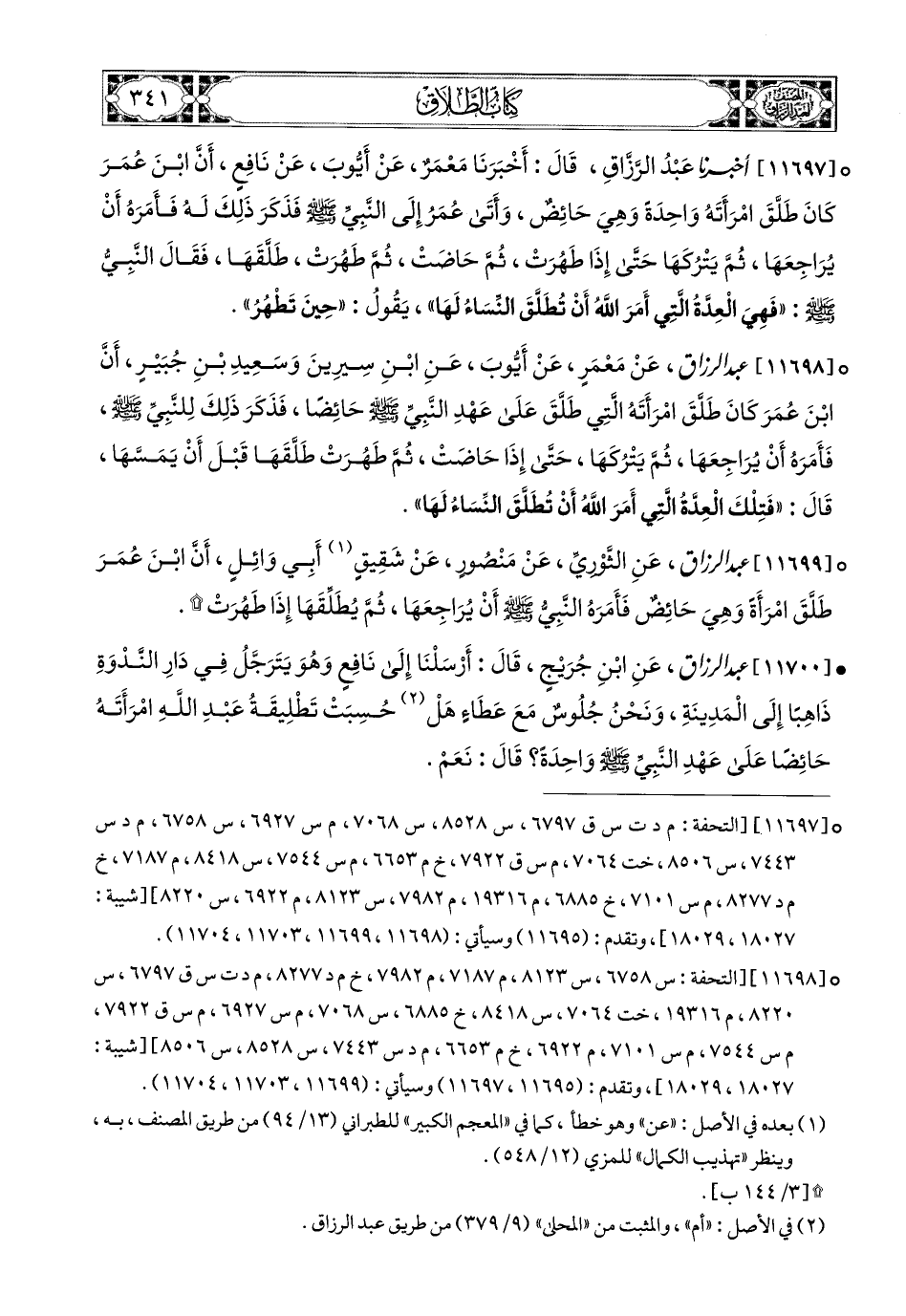 11697- أخبرنا عبد الرزاق، قال: أَخْبَرَنَا مَعْمَرٌ، عَنْ أَيُّوبَ، عَن نَافِعٍ، أَنَّ ابْنَ عُمَرَ كَانَ طَلَّقَ امْرَأَتَهُ وَاحِدَةً وَهِيَ حَائِضٌ، وَأَتَى عُمَرُ إِلَى النَّبِيِّ صَلَّى اللهُ عَلَيْهِ وَسَلَّمَ فَذَكَرَ ذَلِكَ لَهُ، فَأَمَرَهُ أَنْ يُرَاجِعَهَا، ثُمَّ يَتْرُكَهَا حَتَّى إِذَا طَهُرَتْ، ثُمَّ حَاضَتْ، ثُمَّ طَهُرَتْ، طَلَّقَهَا، فَقَالَ النَّبِيُّ صَلَّى اللهُ عَلَيْهِ وَسَلَّمَ: فَهِيَ الْعِدَّةُ الَّتِي أَمَرَ اللهُ أَنْ تُطَلَّقَ النِّسَاءُ لَهَا.