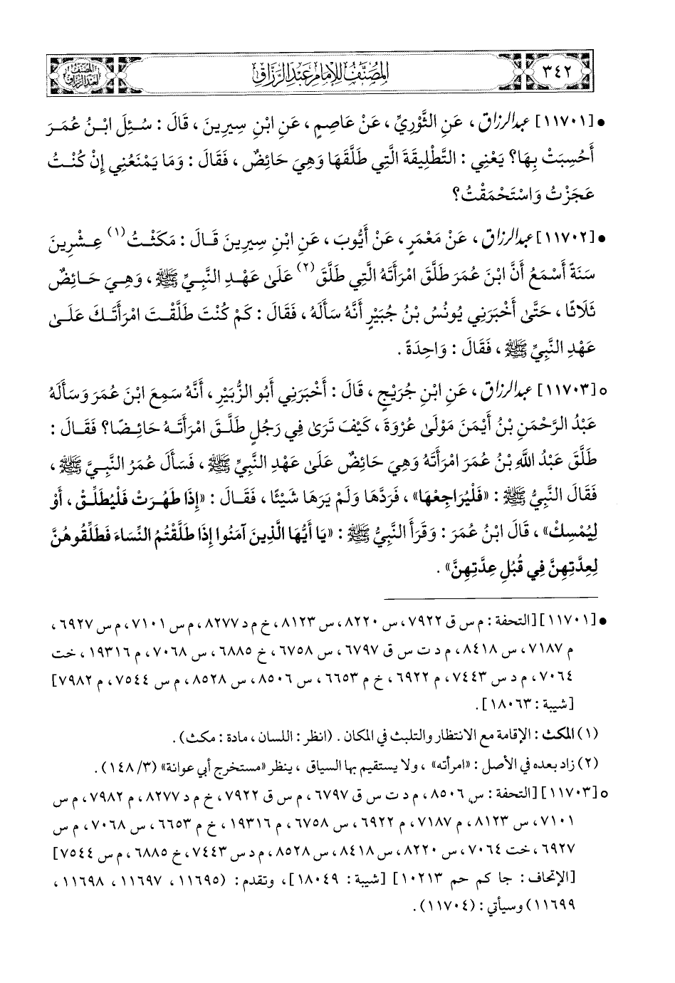 11702- عبد الرزاق، عَنْ مَعْمَرٍ، عَنْ أَيُّوبَ، عَنِ ابْنِ سِيرِينَ، قَالَ: مَكَثْتُ عِشْرِينَ سَنَةً أَسْمَعُ أَنَّ ابْنَ عُمَرَ طَلَّقَ امْرَأَتَهُ الَّتِي طَلَّقَ عَلَى عَهْدِ النَّبِيِّ صَلَّى اللهُ عَلَيْهِ وَسَلَّمَ، وَهِيَ حَائِضٌ ثَلاَثًا، حَتَّى أَخْبَرَنِي يُونُسُ بن جُبَيرٍ أَنَّهُ سَأَلَهُ، فَقَالَ: كَمْ كُنْتَ طَلَّقْتَ امْرَأَتَكَ عَلَى عَهْدِ النَّبِيِّ صَلَّى اللهُ عَلَيْهِ وَسَلَّمَ، فَقَالَ: وَاحِدَةً.