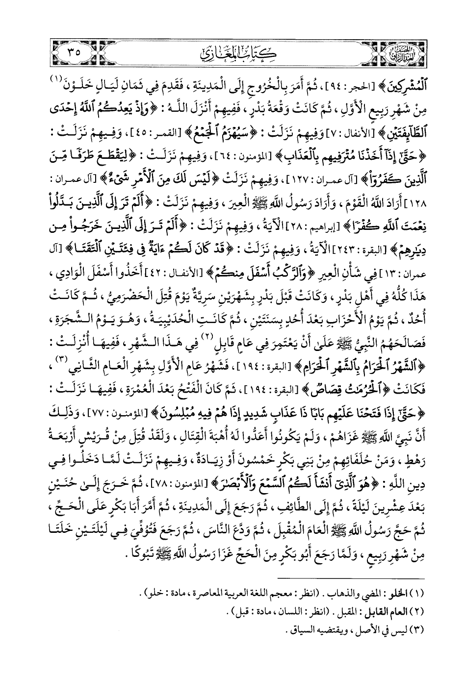 وَفِيهِمْ نَزَلَتْ: {حَتَّى إِذَا أَخَذْنَا مُتْرَفِيهِمْ بِالْعَذَابِ} وَفِيهِمْ نَزَلَتْ: {لِيَقْطَعَ طَرَفًا مِنَ الَّذِينَ كَفَرُوا} وَفِيهِمْ نَزَلَتْ: {لَيْسَ لَكَ مِنَ الأَمْرِ شَيْءٌ} أَرَادَ اللهُ الْقَوْمَ، وَأَرَادَ رَسُولُ اللهِ صَلَّى اللهُ عَلَيْهِ وَسَلَّمَ الْعِيرَ، وَفِيهِمْ نَزَلَتْ: {أَلَمْ تَرَ إِلَى الَّذِينَ بَدَّلُوا نِعْمَةَ اللهِ كُفْرًا} الآيَةَ، وَفِيهِمْ نَزَلَتْ: {أَلَمْ تَرَ إِلَى الَّذِينَ خَرَجُوا مِنْ دِيَارِهِمْ} الآيَةَ، وَفِيهِمْ نَزَلَتْ: {قَدْ كَانَ لَكُمْ آيَةٌ فِي فِئَتَيْنِ الْتَقَتَا} فِي شَأْنِ الْعِيرِ {وَالرَّكْبُ أَسْفَلَ مِنْكُمْ} أَخَذُوا أَسْفَلَ الْوَادِي، هَذَا كُلُّهُ فِي أَهْلِ بَدْرٍ، وَكَانَتْ قَبْلَ بَدْرٍ بِشَهْرَيْنِ سَرِيَّةٌ، يَوْمَ قُتِلَ الْحَضْرَمِيُّ، ثُمَّ كَانَتْ أُحُدٌ، ثُمَّ يَوْمُ الأَحْزَابِ بَعْدَ أُحُدٍ بِسَنَتَيْنِ، ثُمَّ كَانَتِ الْحُدَيْبِيَةُ، وَهُوَ يَوْمُ الشَّجَرَةِ، فَصَالَحَهُمُ النَّبِيُّ صَلَّى اللهُ عَلَيْهِ وَسَلَّمَ عَلَى أَنْ يَعْتَمِرَ فِي عَامِ قَابِلٍ فِي هَذَا الشَّهْرِ، فَفِيهَا أُنْزِلَتْ: {الشَّهْرُ الْحَرَامِ بِالشَّهْرِ الْحَرَامِ} فَشَهْرُ عَامِ الأَوَّلِ بِشَهْرِ الْعَامِ الثَّانِي، فَكَانَتِ {الحُرُمَاتُ قِصَاصٌ} ثُمَّ كَانَتِ الْفَتْحُ بَعْدَ الْعُمْرَةِ، فَفِيهَا نَزَلَتْ: {حَتَّى إِذَا فَتَحْنَا عَلَيْهِمْ بَابًا ذَا عَذَابٍ شَدِيدٍ إِذَا هُمْ فِيهِ مُبْلِسُونَ} وَذَلِكَ أَنَّ نَبِيَّ اللهِ صَلَّى اللهُ عَلَيْهِ وَسَلَّمَ غَزَاهُمْ، وَلَمْ يَكُونُوا أَعَدُّوا لَهُ أُهْبَةَ الْقِتَالِ،
