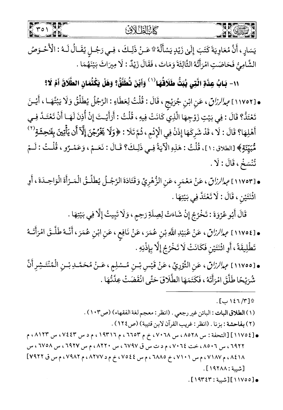 11753 - عبد الرزاق، عَنْ مَعْمَرٍ، عَنِ الزُّهْرِيِّ، وَقَتَادَةَ: الرَّجُلُ يُطَلِّقُ المَرْأَةَ الْوَاحِدَةَ، أَوِ اثْنَتَيْنِ قَالَ: لاَ تَعْتَدُّ [إِلاَّ] (1) فِي بَيْتِهَا، قَالَ أَبو عُرْوَةَ: تَخْرُجُ إِنْ شَاءَتْ لِصِلَةِ رَحِمٍ، وَلاَ تَبِيتُ إِلاَّ فِي بَيْتِهَا.