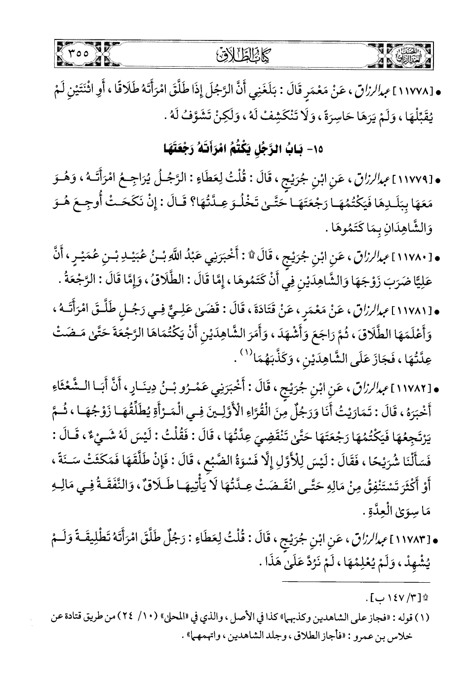 11781- عبد الرزاق، عَنْ مَعْمَرٍ، عَن قَتَادَةَ، قَالَ: قَضَى عَلِيٌّ فِي رَجُلٍ طَلَّقَ امْرَأَتَهُ، وَأَعْلَمَهَا الطَّلاَقَ، ثُمَّ رَاجَعَ، وَأَشْهَدَ، وَأَمَرَ الشَّاهِدَيْنِ أَنْ يَكْتُمَاهَا الرَّجْعَةَ حَتَّى مَضَتْ عِدَّتُهَا، فَجَازَ عَلَى الشَّاهِدَيْنِ، وَكَذَّبَهُمَا.