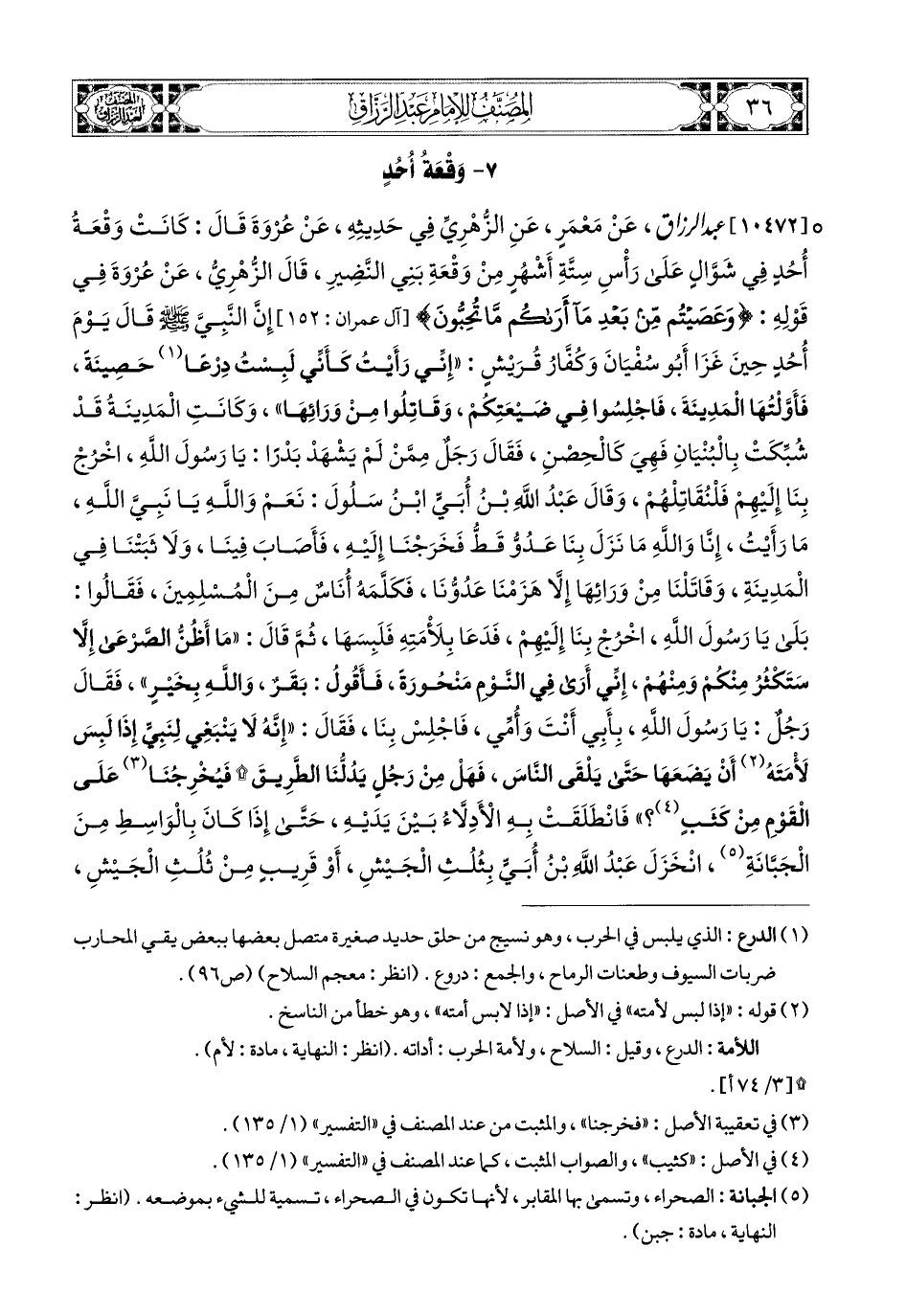 10472- عبد الرزاق، عَنْ مَعْمَرٍ، عَنِ الزُّهْرِيِّ فِي حَدِيثِهِ، عَن عُرْوَةَ قَالَ: كَانَتْ وَقْعَةُ أُحُدٍ فِي شَوَّالٍ عَلَى رَأْسِ سِتَّةِ أَشْهُرٍ مِنْ وَقْعَةِ بَنِي النَّضِيرِ.