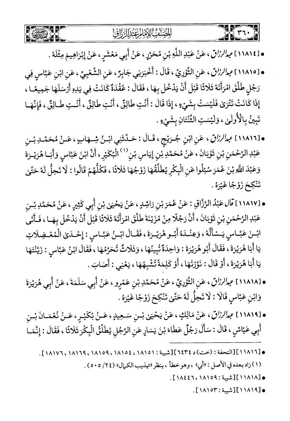 11817- قَالَ عبد الرزاق: عَن عُمَرَ بْنِ رَاشِدٍ، عَن يَحيَى بنِ أَبِي كَثِيرٍ، عَن مُحَمَّدِ بْنِ عَبدِ الرَّحْمَنِ بْنِ ثَوْبَانَ، أَنَّ رَجُلاً مِنْ مُزَيْنَةَ طَلَّقَ امْرَأَتَهُ ثَلاَثًا، قَبْلَ أَنْ يَدْخُلَ بِهَا، فَأَتَى ابْنَ عَبَّاسٍ يَسْأَلُهُ، وَعِنْدَهُ أَبو هُرَيرَةَ، فَقَالَ ابْنُ عَبَّاسٍ: إِحْدَى المُعْضَلاَتِ يَا أَبَا هُرَيرَةَ، فَقَالَ أَبو هُرَيرَةَ: وَاحِدَةٌ تُبِينُهَا، وَثَلاَثٌ تُحَرِّمُهَا، فَقَالَ ابْنُ عَبَّاسٍ: زَيَّنْتَهَا يَا أَبَا هُرَيرَةَ، أَوْ قَالَ: نَوَّرْتَهَا، أَوْ كَلِمَةً تُشْبِهُهَا. يَعْنِي: أَصَابَ.