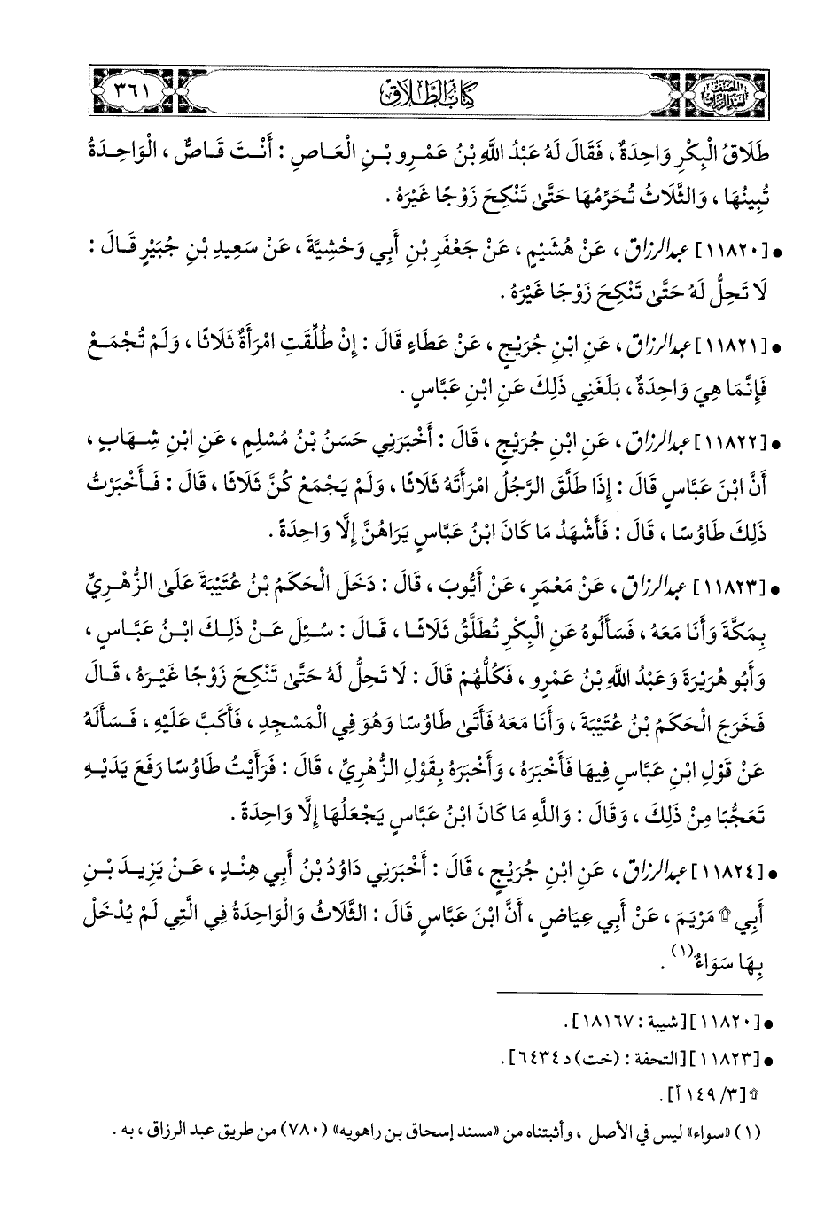 11822- عبد الرزاق، عَنِ ابْنِ جُرَيْجٍ، قَالَ: أَخْبَرَنِي حَسَنُ بن مُسْلِمٍ، عَنِ ابْنِ شِهَابٍ، أَنَّ ابْنَ عَبَّاسٍ، قَالَ: إِذَا طَلَّقَ الرَّجُلُ امْرَأَتَهُ ثَلاَثًا، وَلَمْ يَجْمَعْ كُنَّ ثَلاَثًا، قَالَ: فَأَخْبَرْتُ ذَلِكَ طَاوُوسًا قَالَ: فَأَشْهَدُ مَا كَانَ ابْنُ عَبَّاسٍ يَرَاهُنَّ إِلاَّ وَاحِدَةً.