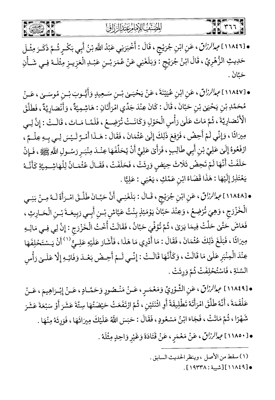 11848- عبد الرزاق، عَنِ ابْنِ جُرَيْجٍ، قَالَ: بَلَغَنِي أَنَّ حَبَّانَ طَلَّقَ امْرَأَةً لَهُ مِنْ بَنِي الْخَزْرَجِ، وَهِيَ تُرْضِعُ، وَعِنْدَ حَبَّانَ يَوْمَئِذٍ بِنْتُ عَيَّاشِ بْنِ أَبِي رَبِيعَةَ بْنِ الْحَارِثِ، فَعَاشَ، حَتَّى حَلَّتْ فِيمَا يَرَى، ثُمَّ تُوُفِّيَ حَبَّانُ، فَقَالَتْ أُخْتُ الْخَزْرَجِ: إِنَّ لِي فِي مَالِهِ مِيرَاثًا، فَبَلَغَ ذَلِكَ عُثْمَانَ، فَقَالَ: مَا أَدْرِي مَا هَذَا، فَأَشَارَ عَلَيْهِ عَلِيٌّ أَنْ يَسْتَحْلِفَهَا عِنْدَ المِنْبَرِ عَلَى مَا قَالَتْ، وَكَأَنَّهَا قَالَتْ: إِنِّي لَمْ أَحِضْ بَعْدَ وَفَاتِهِ إِلاَّ عَلَى رَأْسِ السَّنَةِ، فَاسْتُحْلِفَتْ، ثُمَّ وَرِثَتْ.