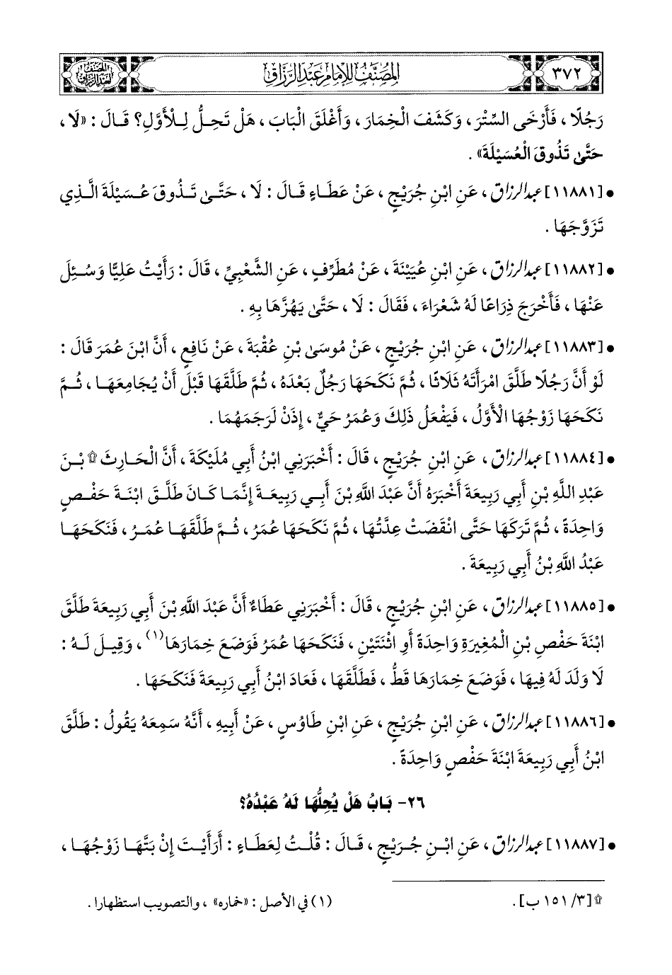 11884- عبد الرزاق، عَنِ ابْنِ جُرَيْجٍ، قَالَ: أَخْبَرَنِي ابْنُ أَبِي مُلَيْكَةَ، أَنَّ الْحَارِثَ بن عَبدِ اللهِ بْنِ أَبِي رَبِيعَةَ أَخْبَرَهُ، أَنَّ عَبدَ اللهِ بن أَبِي رَبِيعَةَ إِنَّمَا كَانَ طَلَّقَ ابْنَةَ حَفْصٍ وَاحِدَةً، ثُمَّ تَرَكَهَا حَتَّى انْقَضَتْ عِدَّتُهَا، ثُمَّ نَكَحَهَا عُمَرُ، ثُمَّ طَلَّقَهَا عُمَرُ، فَنَكَحَهَا عَبدُ اللهِ بن أَبِي رَبِيعَةَ.