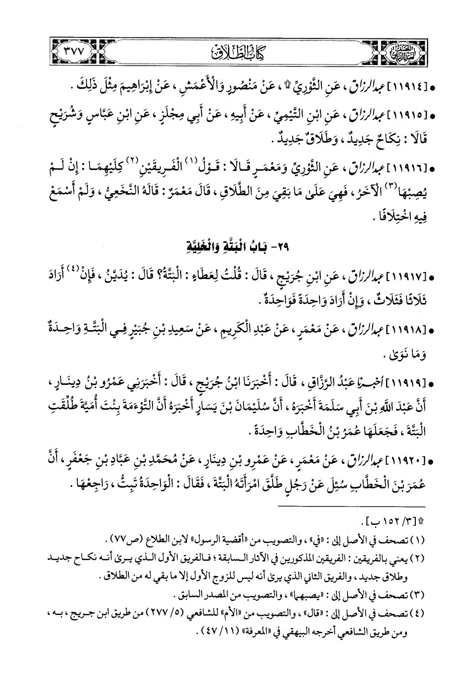 11919- أخبرنا عبد الرزاق، قال: أَخْبَرَنَا ابْنُ جُرَيْجٍ، قَالَ: أَخْبَرَنِي عَمْرُو بن دِينَارٍ، أَنَّ عَبدَ اللهِ بن أَبِي سَلَمَةَ أَخْبَرَهُ، أَنَّ سُلَيْمَانَ بن يَسَارٍ أَخْبَرَهُ، أَنَّ التَّوْأَمَةَ بِنْتَ أُمَيَّةَ طُلِّقَتِ الْبَتَّةَ، فَجَعَلَهَا عُمَرُ بن الْخَطَّابِ وَاحِدَةً.