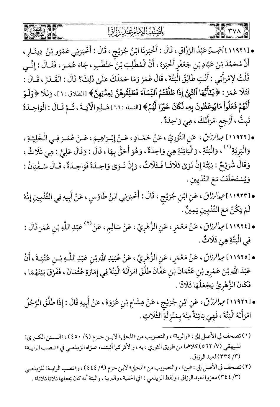 11925- عبد الرزاق، عَنْ مَعْمَرٍ، عَنِ الزُّهْرِيِّ، عَن عُبَيْدِ اللهِ بْنِ عَبدِ اللهِ بْنِ عُتْبَةَ، أَنَّ عَبدَ اللهِ بن عَمْرِو بنِ عُثْمَانَ بْنِ عَفَّانَ طَلَّقَ امْرَأَتَهُ الْبَتَّةَ فِي إِمَارَةِ عُثْمَانَ، فَفَرَّقَ بَيْنَهُمَا، فَكَانَ الزُّهْرِيُّ يَجْعَلُهَا ثَلاَثًا.