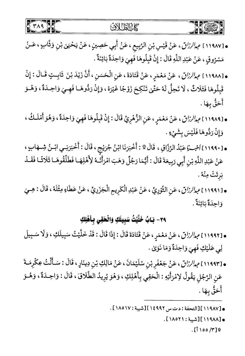11992- عبد الرزاق، عَنْ مَعْمَرٍ، عَن قَتَادَةَ، قَالَ: إِذَا قَالَ: قَدْ خَلَّيْتُ سَبِيلَكِ، وَلاَ سَبِيلَ لِي عَلَيْكِ، فَهِيَ وَاحِدَةٌ وَمَا نَوَى.