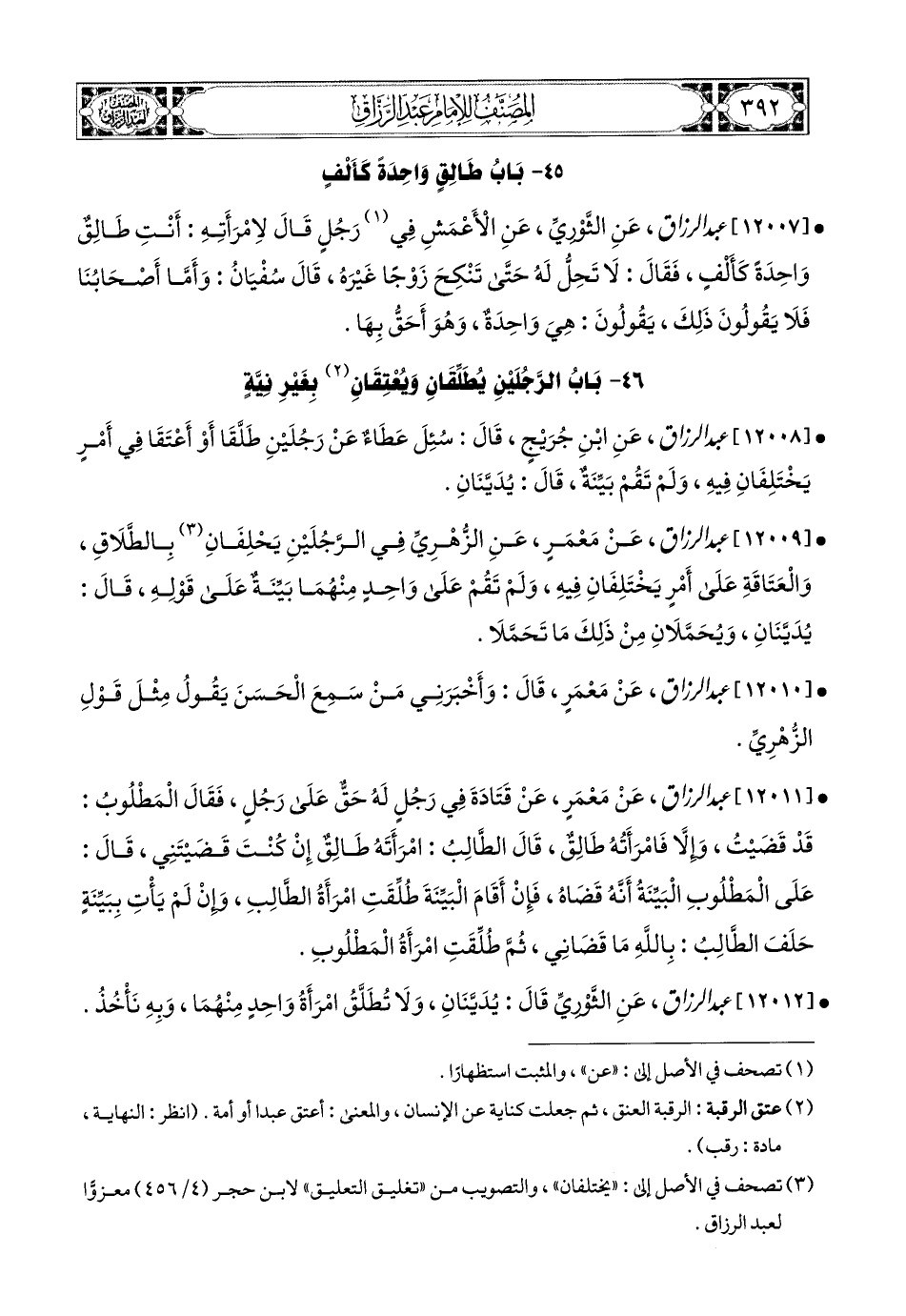 12012- عبد الرزاق، عَنِ الثَّورِيِّ، قَالَ: يُدَيَّنَانِ، وَلاَ تُطَلَّقُ امْرَأَةُ وَاحِدٍ مِنْهُمَا.