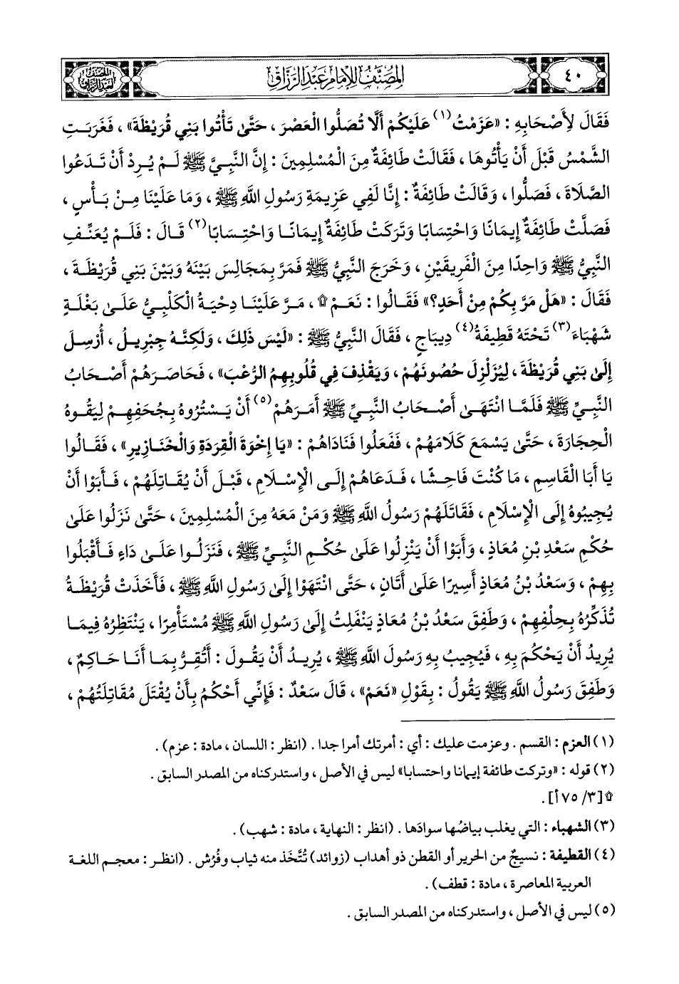 فَغَرَبِتِ الشَّمْسُ قَبْلَ أَنْ يَأْتُوهَا، فَقَالَتْ طَائِفَةٌ مِنَ المُسْلِمِينَ: إِنَّ النَّبِيَّ صَلَّى اللهُ عَلَيْهِ وَسَلَّمَ لَمْ يُرِدْ أَنْ تَدَعُوا الصَّلاَةَ فَصَلُّوا، وَقَالَتْ طَائِفَةٌ: إِنَّا لَفِي عَزِيمَةِ رَسُولِ اللهِ صَلَّى اللهُ عَلَيْهِ وَسَلَّمَ، وَمَا عَلَيْنَا مِنْ بَأْسٍ، فَصَلَّتْ طَائِفَةٌ إِيمَانًا وَاحْتِسَابًا، وَتَرَكَتْ طَائِفَةٌ إِيمَانًا وَاحْتِسَابًا، قَالَ: فَلَمْ يُعَنِّفِ النَّبِيُّ صَلَّى اللهُ عَلَيْهِ وَسَلَّمَ وَاحِدًا مِنَ الْفَرِيقَيْنِ، وَخَرَجَ النَّبِيُّ صَلَّى اللهُ عَلَيْهِ وَسَلَّمَ، فَمَرَّ بِمَجَالِسَ بَيْنَهُ وَبَيْنَ بَنِي قُرَيْظَةَ، فَقَالَ: هَلْ مَرَّ بِكُمْ مِنْ أَحَدٍ؟ فَقَالُوا: نَعَمْ، مَرَّ عَلَيْنَا دِحْيَةُ الْكَلْبِيُّ، عَلَى بَغْلَةٍ شَهْبَاءَ، تَحْتَهُ قَطِيفَةُ دِيبَاجٍ، فَقَالَ النَّبِيُّ صَلَّى اللهُ عَلَيْهِ وَسَلَّمَ: لَيْسَ ذَلِكَ، وَلَكِنَّهُ جِبْرِيلُ، أُرْسِلَ إِلَى بَنِي قُرَيْظَةَ لِيُزَلْزِلَ حُصُونَهُمْ، وَيَقْذِفَ فِي قُلُوبِهِمُ الرُّعْبَ، فَحَاصَرَهُمْ أَصْحَابُ النَّبِيِّ صَلَّى اللهُ عَلَيْهِ وَسَلَّمَ، فَلَمَّا انْتَهَى أَصْحَابُ النَّبِيِّ صَلَّى اللهُ عَلَيْهِ وَسَلَّمَ، أَمَرَهُمْ أَنْ يَسْتُرُوهُ بِجُحَفِهِمْ لِيَقُوهُ الْحِجَارَةَ، حَتَّى يَسْمَعَ كَلاَمَهُمْ، فَفَعَلُوا، فَنَادَاهُمْ: يَا إِخْوَةَ الْقِرَدَةِ وَالْخَنَازِيرَ، فَقَالُوا: يَا أَبَا الْقَاسِمِ، مَا كُنْتَ فَاحِشًا، فَدَعَاهُمْ إِلَى الإِسْلاَمِ قَبْلَ أَنْ يُقَاتِلَهُمْ، فَأَبَوْا أَنْ يُجِيبُوهُ إِلَى الإِسْلاَمِ، فَقَاتَلَهُمْ رَسُولُ اللهِ صَلَّى اللهُ عَلَيْهِ وَسَلَّمَ وَمَنْ مَعَهُ مِنَ المُسْلِمِينَ، حَتَّى نَزَلُوا عَلَى حُكْمِ سَعْدِ بْنِ مُعَاذٍ، وَأَبَوْا أَنْ يَنْزِلُوا عَلَى حُكْمِ النَّبِيِّ صَلَّى اللهُ عَلَيْهِ وَسَلَّمَ، فَنَزَلُوا عَلَى دَاءٍ، فَأَقْبَلُوا بِهِمْ، وَسَعْدُ بن مُعَاذٍ أَسِيرًا عَلَى أَتَانٍ، حَتَّى انْتَهَوْا إِلَى رَسُولِ اللهِ صَلَّى اللهُ عَلَيْهِ وَسَلَّمَ، فَأَخَذَتْ قُرَيْظَةُ تُذَكِّرُهُ بِحِلْفِهِمْ،