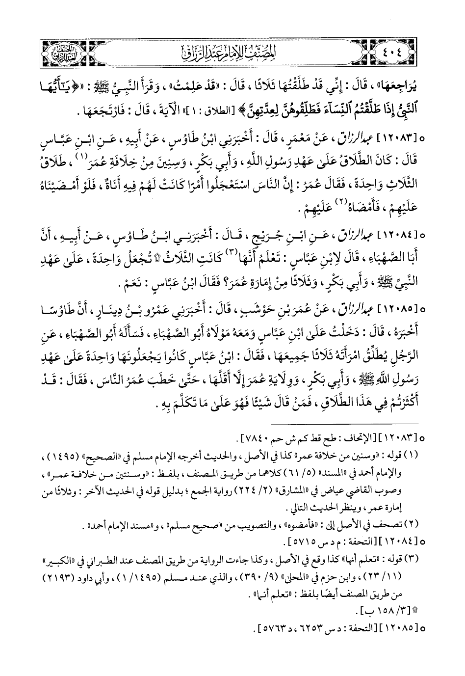 12083 - عبد الرزاق، عَنْ مَعْمَرٍ، قَالَ: أَخْبَرَنِي ابْنُ طَاوُوسٍ، عَنْ أَبِيهِ، عَنِ ابْنِ عَبَّاسٍ، قَالَ: كَانَ الطَّلاَقُ عَلَى عَهْدِ رَسُولِ اللهِ صَلَّي اللهُ عَلَيْهِ وَسَلَّمَ، وَأَبِي بَكْرٍ، وَسِنِينَ (1) مِنْ خِلاَفَةِ عُمَرَ، طَلاَقُ الثَّلاَثِ وَاحِدَةٌ، فَقَالَ عُمَرُ: إِنَّ النَّاسَ اسْتَعْجَلُوا أَمْرًا كَانَتْ لَهُمْ فِيهِ أَنَاةٌ، فَلَوْ أَمْضَيْنَاهُ عَلَيْهِمْ، فَأَمْضَاهُ عَلَيْهِمْ.