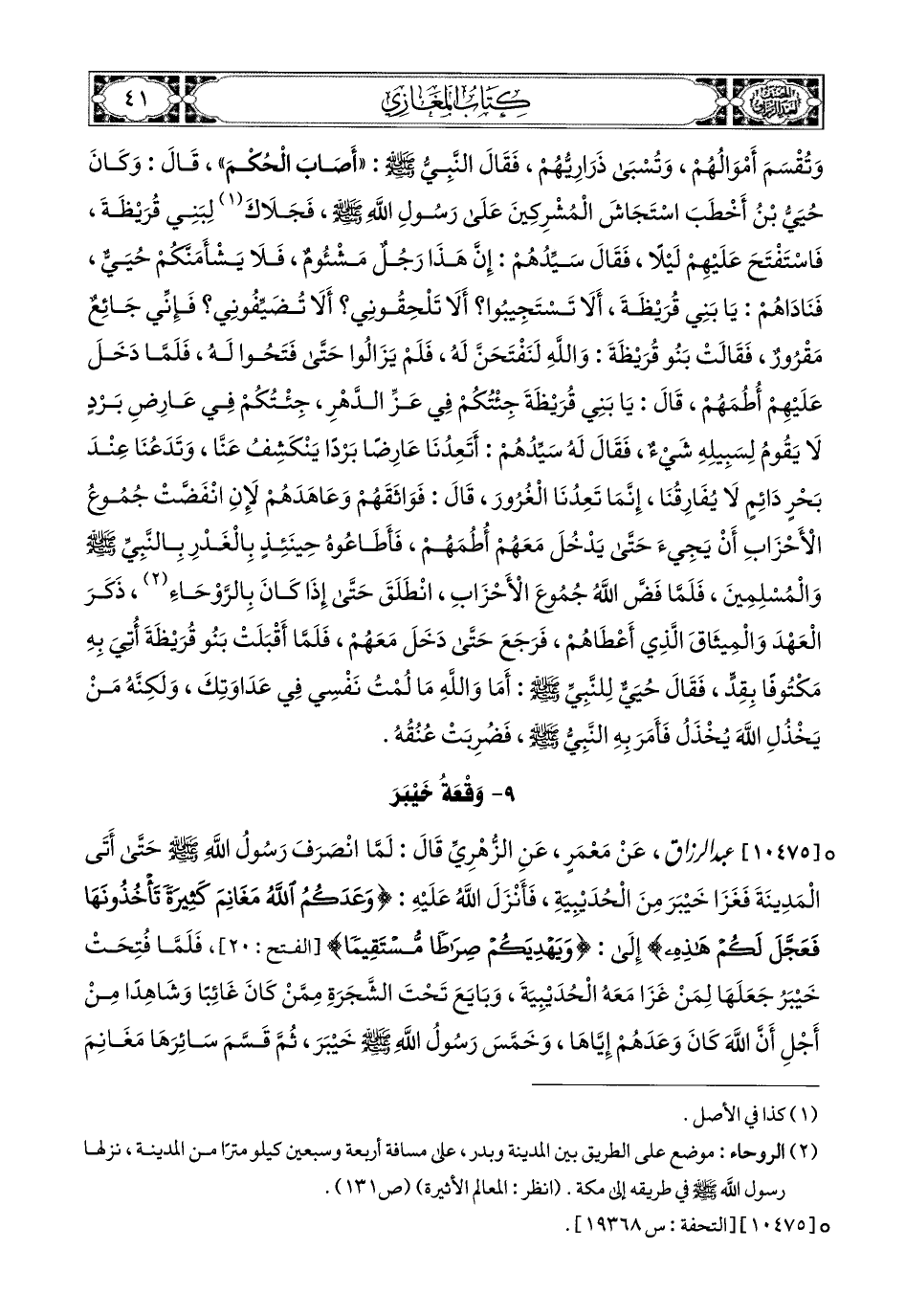 10475- عبد الرزاق، عَنْ مَعْمَرٍ، عَنِ الزُّهْرِيِّ، قَالَ: لَمَّا انْصَرَفَ رَسُولُ اللهِ صَلَّى اللهُ عَلَيْهِ وَسَلَّمَ، حَتَّى أَتَى المَدِينَةَ، فَغَزَا خَيْبَرَ مِنَ الْحُدَيْبِيَةِ، فَأَنْزَلَ اللهُ عَلَيْهِ: {وَعَدَكُمُ اللهُ مَغَانِمَ كَثِيرَةً تَأْخُذُونَهَا فَعَجَّلَ لَكُمْ هَذِهِ} إِلَى: {وَيَهْدِيَكُمْ صِرَاطًا مُسْتَقِيمًا} فَلَمَّا فُتِحَتْ خَيْبَرُ، جَعَلَهَا لِمَنْ غَزَا مَعَهُ الْحُدَيْبِيَةَ، وَبَايَعَ تَحْتَ الشَّجَرَةِ مِمَّنْ كَانَ غَائِبًا وَشَاهِدًا، مِنْ أَجْلِ أَنَّ اللهَ كَانَ وَعَدَهُمْ إِيَّاهَا، وَخَمَّسَ رَسُولُ اللهِ صَلَّى اللهُ عَلَيْهِ وَسَلَّمَ خَيْبَرَ، ثُمَّ قَسَمَ سَائِرَهَا مَغَانِمَ بَيْنَ مَنْ شَهِدَهَا مِنَ المُسْلِمِينَ، وَمَنْ غَابَ عَنْهَا مِنْ أَهْلِ الْحُدَيْبِيَةِ، وَلَمْ يَكُنْ لِرَسُولِ اللهِ صَلَّى اللهُ عَلَيْهِ وَسَلَّمَ، وَلاَ لأَصْحَابِهِ عُمَّالٌ يَعْمَلُونَ خَيْبَرَ، وَلاَ يَزْرَعُونَهَا.