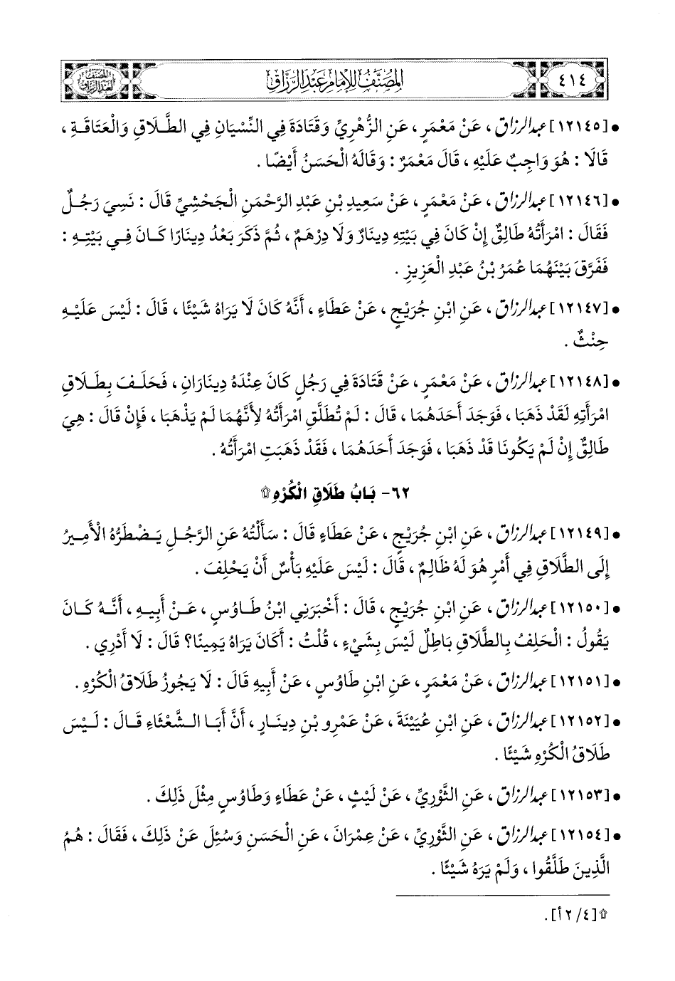 12151- عبد الرزاق، عَنْ مَعْمَرٍ، عَنِ ابْنِ طَاوُوسٍ، عَنْ أَبِيهِ، قَالَ: لاَ يَجُوزُ طَلاَقُ الْكُرْهِ.