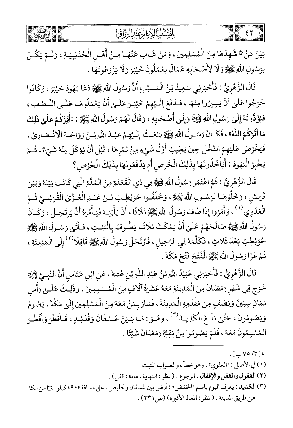 قَالَ الزُّهْرِيُّ: ثُمَّ اعْتَمَرَ رَسُولُ اللهِ صَلَّى اللهُ عَلَيْهِ وَسَلَّمَ فِي ذِي الْقِعْدَةِ مِنَ المُدَّةِ الَّتِي كَانَتْ بَيْنَهُ وَبَيْنَ قُرَيْشٍ، وَخَلَّوْهَا لِرَسُولِ اللهِ صَلَّى اللهُ عَلَيْهِ وَسَلَّمَ، وَخَلَّفُوا حُوَيْطِبَ بن عَبدِ الْعُزَّى الْقُرَشِيَّ، ثُمَّ الْعَدَوِيَّ، وَأَمَرُوا إِذَا طَافَ رَسُولُ اللهِ صَلَّى اللهُ عَلَيْهِ وَسَلَّمَ ثَلاَثًا، أَنْ يَأْتِيَهُ فَيَأْمُرَهُ أَنْ يَرْتَحِلَ، وَكَانَ رَسُولُ اللهِ صَلَّى اللهُ عَلَيْهِ وَسَلَّمَ صَالَحَهُمْ عَلَى أَنْ يَمْكُثَ ثَلاَثًا يَطُوفُ بِالْبَيْتِ، فَأَتَى رَسُولُ اللهِ صَلَّى اللهُ عَلَيْهِ وَسَلَّمَ حُوَيْطِبَ بَعْدَ ثَلاَثٍ، فَكَلَّمَهُ فِي الرَّحِيلِ، فَارْتَحَلَ رَسُولُ اللهِ صَلَّى اللهُ عَلَيْهِ وَسَلَّمَ قَافِلاً إِلَى المَدِينَةِ، ثُمَّ غَزَا رَسُولُ اللهِ صَلَّى اللهُ عَلَيْهِ وَسَلَّمَ الْفَتْحَ: فَتْحَ مَكَّةَ.