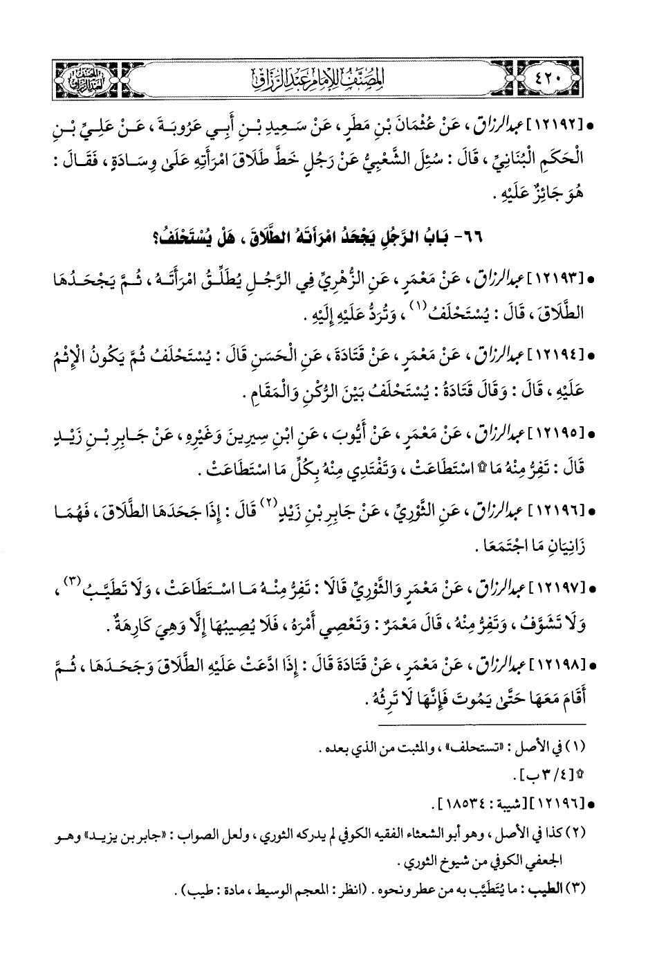 12193- عبد الرزاق، عَنْ مَعْمَرٍ، عَنِ الزُّهْرِيِّ، فِي الرَّجُلِ يُطَلِّقُ امْرَأَتَهُ، ثُمَّ يَجْحَدُهَا الطَّلاَقَ، قَالَ: يُسْتَحْلَفُ، وَتُرَدُّ عَلَيْهِ إِلَيْهِ.