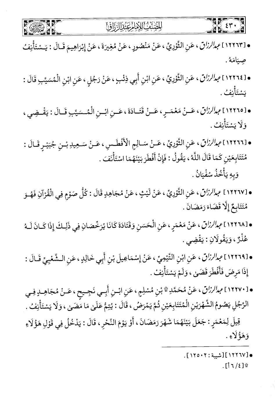 12263- عبد الرزاق، عَنِ الثَّورِيِّ، عَنْ مَنصُورٍ، عَن مُغِيرَةَ، عَن إِبرَاهِيمَ، قَالَ: يَسْتَأْنِفُ صِيَامَهُ.