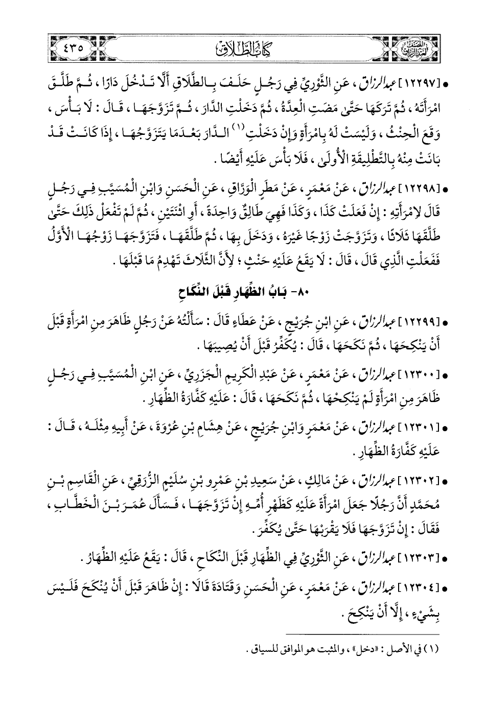 12302- عبد الرزاق، عَنْ مَالِكٍ، عَن سَعيدِ بْنِ عَمْرِو بنِ سُلَيْمٍ الزُّرَقِيِّ، عَنِ الْقَاسِمِ بْنِ مُحَمَّدٍ؛ أَنَّ رَجُلاً جَعَلَ امْرَأَةً عَلَيْهِ كَظَهْرِ أُمِّهِ إِنْ تَزَوَّجَهَا، فَسَأَلَ عُمَرَ بن الْخَطَّابِ، فَقَالَ: إِنْ تَزَوَّجَهَا فَلاَ يَقْرَبُهَا، حَتَّى يُكَفِّرَ.