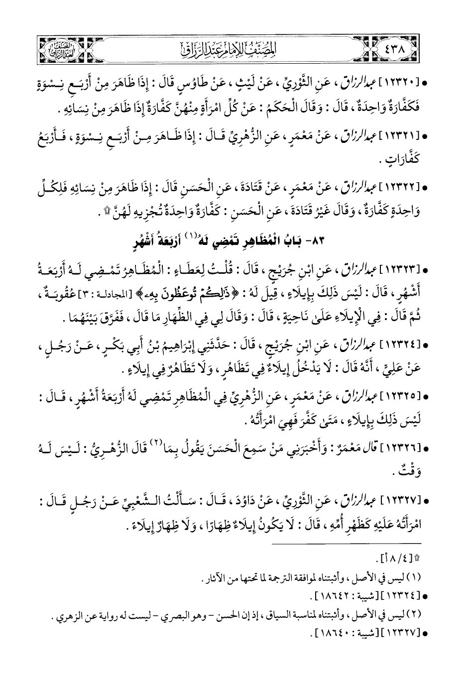 12325- عبد الرزاق، عَنْ مَعْمَرٍ، عَنِ الزُّهْرِيِّ فِي المُظَاهِرِ تَمْضِي لَهُ أَرْبَعَةُ أَشْهُرٍ، قَالَ: لَيْسَ ذَلِكَ بِإِيلاَءٍ، مَتَى كَفَّرَ فَهِيَ امْرَأَتُهُ.