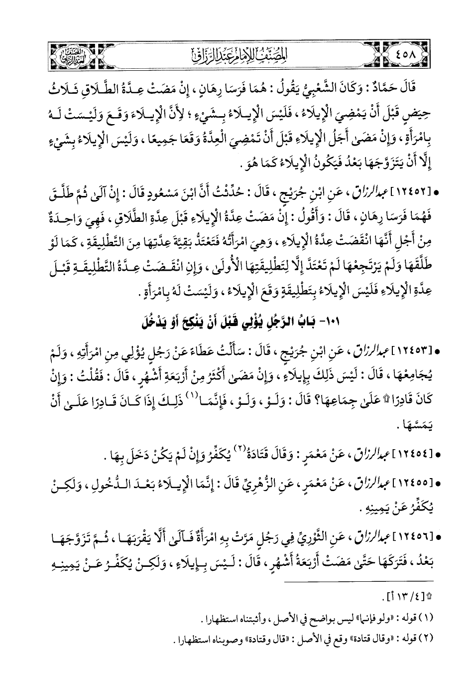 12456 - عبد الرزاق، عَنِ الثَّورِيِّ؛ فِي رَجُلٍ مَرَّتْ بِهِ امْرَأَةٌ، فَآلَى أَنْ لاَ يَقْرَبَهَا، ثُمَّ تَزَوَّجَهَا بَعْدُ، فَتَرَكَهَا، حَتَّى مَضَتْ أَرْبَعَةُ أَشْهُرٍ قَالَ: لَيْسَ بِإِيلاَءٍ، وَلَكِنْ يُكَفِّرُ عَن يَمِينِهِ بِإِطْعَامِ عَشَرَةِ مَسَاكِينَ، لأَنَّ الإِيلاَءَ وَقَعَ، وَلَيْسَتْ لَهُ بَامْرَأَةٍ، وَإِنْ قَالَ: إِنْ تَزَوَّجْتُهَا فَوَاللهِ لاَ أَقْرَبُهَا، فَإِنْ تَزَوَّجَهَا وَقَعَ الإِيلاَءُ.