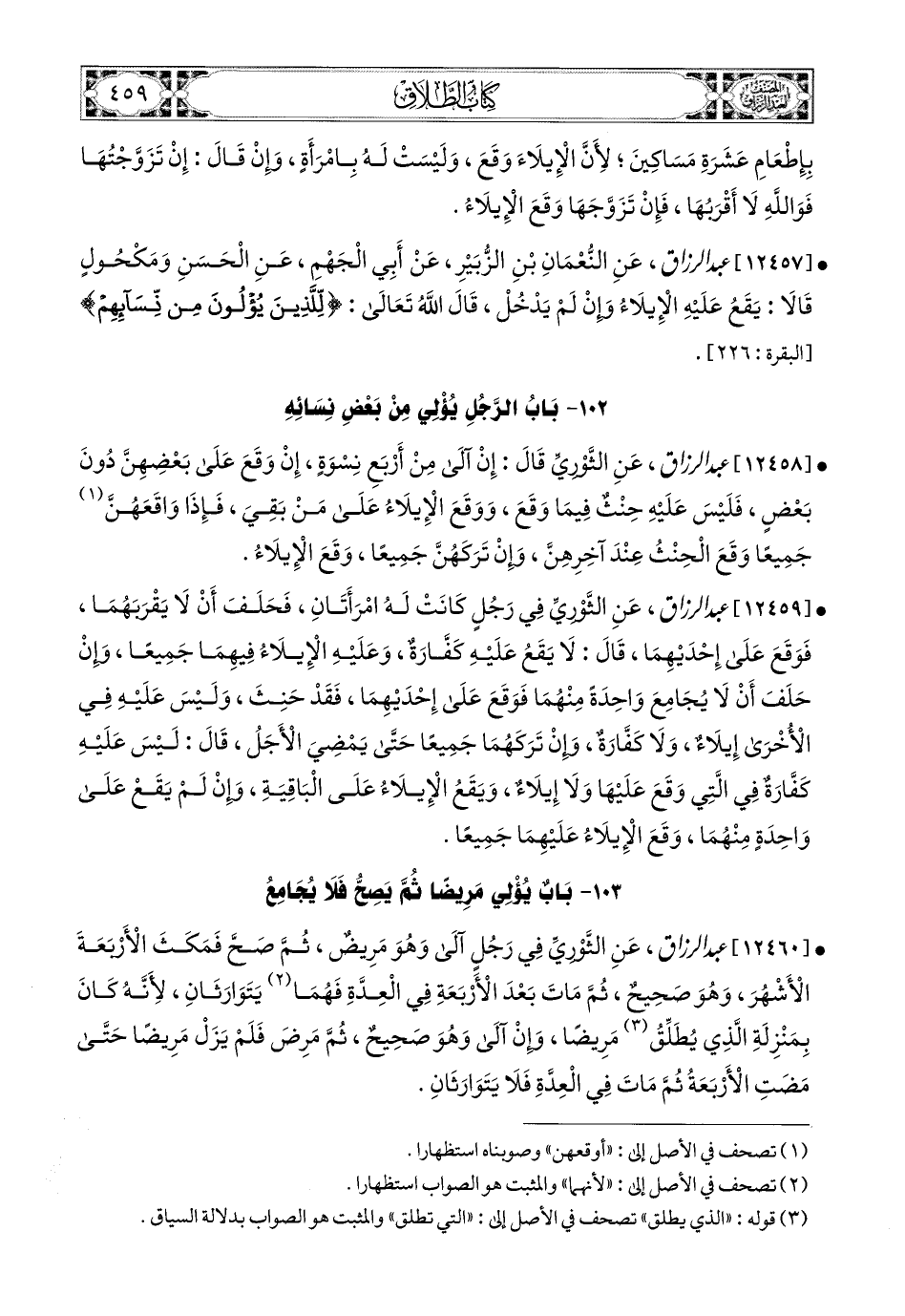 12459 - عبد الرزاق، عَنِ الثَّورِيِّ؛ فِي رَجُلٍ كَانَتْ لَهُ امْرَأَتَانِ، فَحَلَفَ أَنْ لاَ يَقْرَبَهُمَا، فَوَقَعَ عَلَى إِحْدَيهمَا (1) قَالَ: لاَ يَقَعُ عَلَيْهِ كَفَّارَةٌ، وَعَلَيْهِ الإِيلاَءُ فِيهِمَا جَمِيعًا، وَإِنْ حَلَفَ أَنْ لاَ يُجَامِعَ وَاحِدَةً مِنْهُمَا، فَوَقَعَ عَلَى إِحْدَيهِمَا (1) فَقَدْ حَنِثَ، وَلَيْسَ عَلَيْهِ فِي الأُخْرَى إِيلاَءٌ، وَلاَ كَفَّارَةٌ، وَإِنْ تَرَكَهُمَا جَمِيعًا، حَتَّى يَمْضِيَ الأَجَلُ، قَالَ: لَيْسَ عَلَيْهِ كَفَّارَةٌ فِي الَّتِي وَقَعَ عَلَيْهَا وَلاَ إِيلاَءٌ، وَيَقَعُ الإِيلاَءُ عَلَى الْبَاقِيَةِ، وَإِنْ لَمْ يَقَعْ عَلَى وَاحِدَةٍ مِنْهُمَا، وَقَعَ الإِيلاَءُ عَلَيْهِمَا جَمِيعًا.