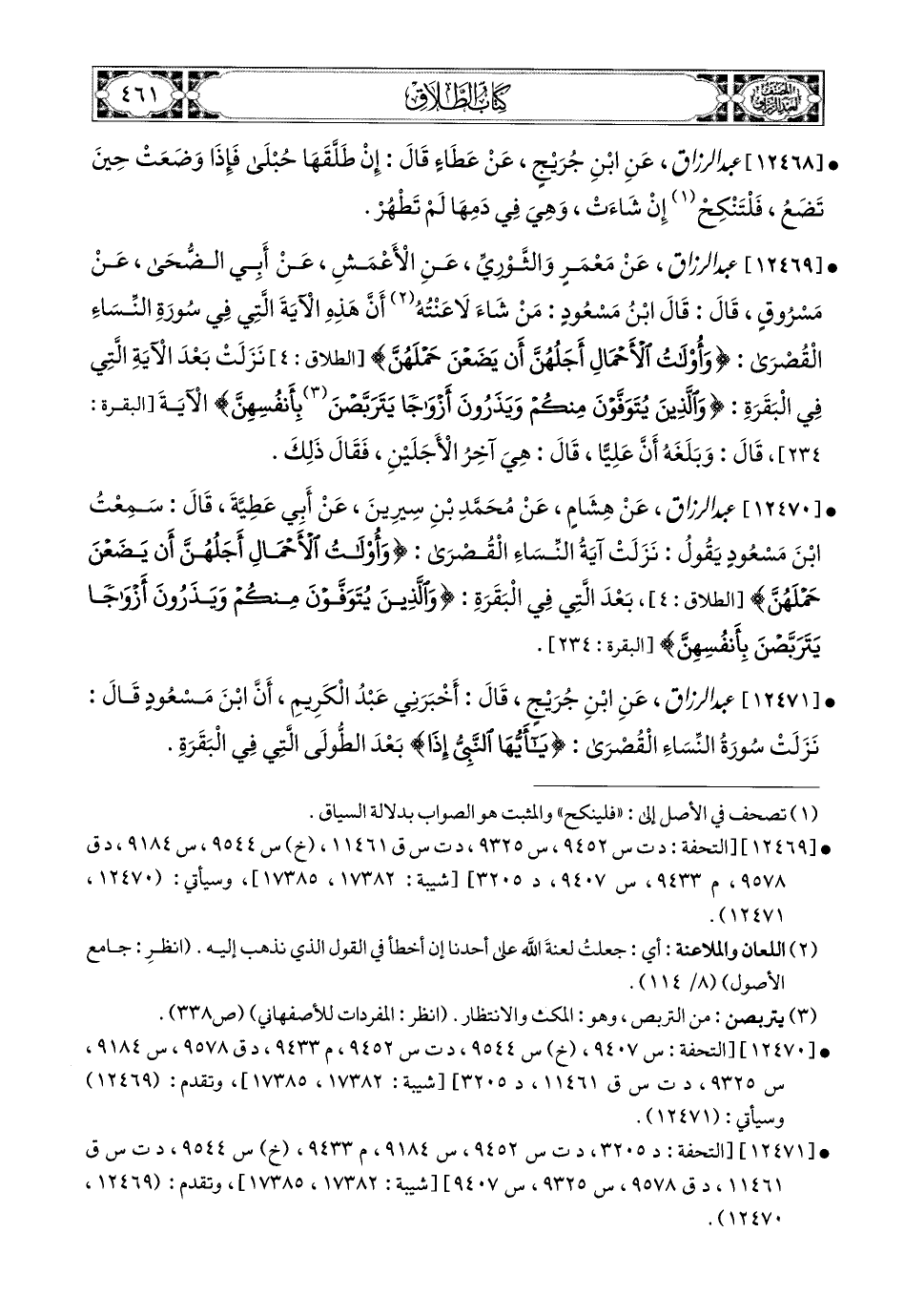 12469- عبد الرزاق، عَنْ مَعْمَرٍ، وَالثَّورِيِّ، عَنِ الأَعمَشِ، عَنْ أَبِي الضُّحَى، عَنْ مَسْرُوقٍ، قَالَ: قَالَ ابْنُ مَسْعُودٍ: مَنْ شَاءَ لاَعَنْتُهُ أَنَّ هَذِهِ الآيَةَ الَّتِي فِي سُورَةِ النِّسَاءِ الْقُصْرَى: {وَأُولاَتُ الأَحْمَالِ أَجَلُهُنَّ أَنْ يَضَعْنَ حَمْلَهُنَّ} نَزَلَتْ بَعْدَ الآيَةِ الَّتِي فِي الْبَقَرَةِ: {وَالَّذِينَ يُتَوَفَّوَنَ مِنْكُمْ وَيَذَرُونَ أَزْوَاجًا يَتَرَبَّصْنَ بِأَنْفُسِهِنَّ} الآيَةَ، قَالَ: وَبَلَغَهُ أَنَّ عَلِيًّا قَالَ: هِيَ آخِرُ الأَجَلَيْنِ، فَقَالَ ذَلِكَ.
