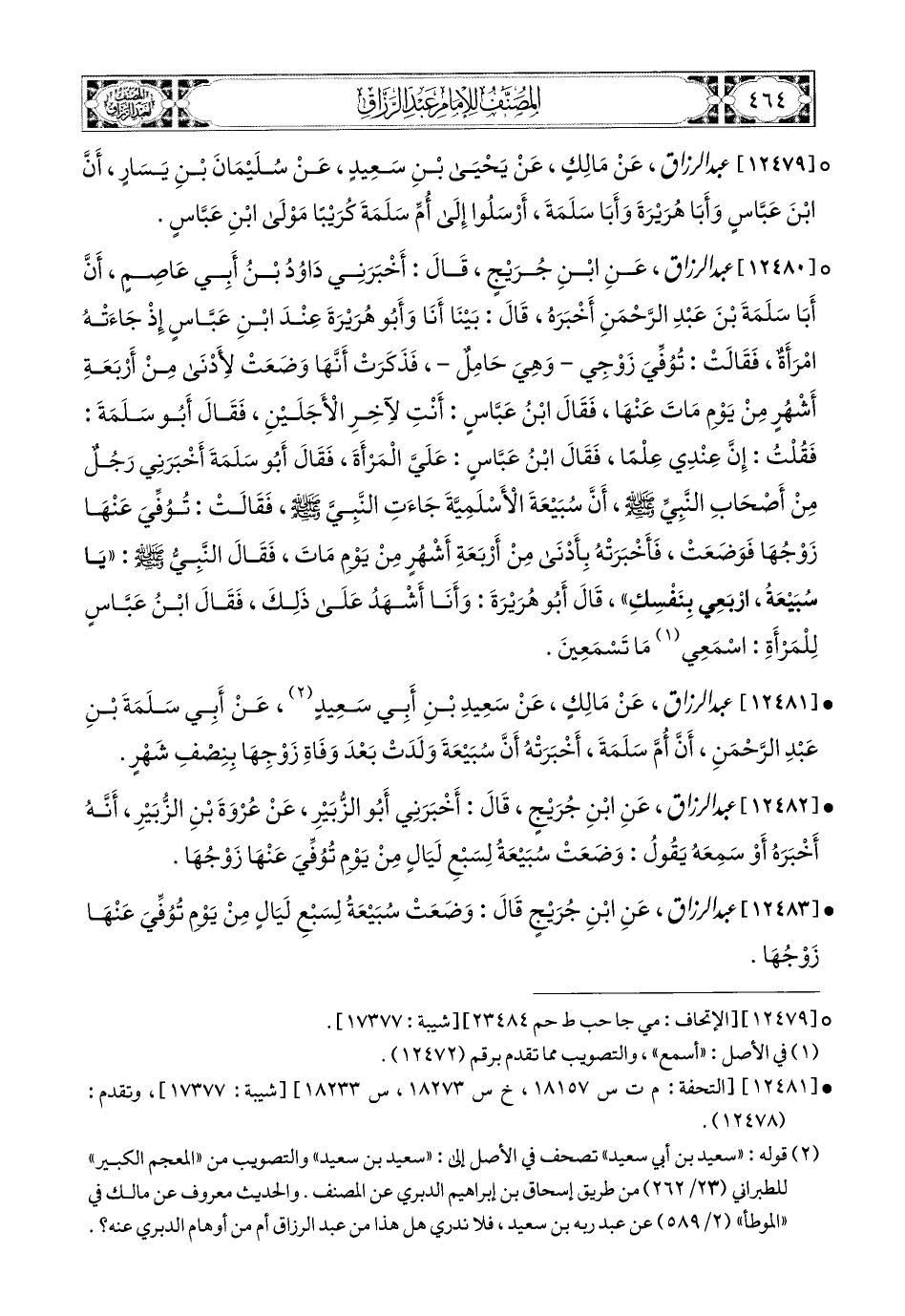 12480- عبد الرزاق، عَنِ ابْنِ جُرَيْجٍ، قَالَ: أَخْبَرَنِي دَاوُدُ بن أَبِي عَاصِمٍ، أَنَّ أَبَا سَلَمَةَ بن عَبدِ الرَّحْمَنِ أَخْبَرَهُ قَالَ: بَيْنَا أَنَا وَأَبو هُرَيرَةَ عِنْدَ ابْنِ عَبَّاسٍ، إِذْ جَاءَتْهُ امْرَأَةٌ، فَقَالَتْ: تُوُفِّيَ زَوْجِي، وَهِيَ حَامِلٌ، فَذَكَرَتْ أَنَّهَا وَضَعَتْ لأَدْنَى مِنْ أَرْبَعَةِ أَشْهُرٍ، مِنْ يَوْمِ مَاتَ عَنْهَا، فَقَالَ ابْنُ عَبَّاسٍ: أَنْتِ لآخِرِ الأَجَلَيْنِ، فَقَالَ أَبو سَلَمَةَ: فَقُلْتُ: إِنَّ عِنْدِي عِلْمًا، فَقَالَ ابْنُ عَبَّاسٍ: عَلَيَّ المَرْأَةُ، فَقَالَ أَبو سَلَمَةَ: أَخْبَرَنِي رَجُلٌ مِنْ أَصْحَابِ النَّبِيِّ صَلَّى اللهُ عَلَيْهِ وَسَلَّمَ، أَنَّ سُبَيْعَةَ الأَسْلَمِيَّةَ جَاءَتِ النَّبِيَّ صَلَّى اللهُ عَلَيْهِ وَسَلَّمَ، فَقَالَتْ: تُوُفِّيَ عَنْهَا زَوْجُهَا، فَوَضَعَتْ، فَأَخْبَرَتْهُ بِأَدْنَى مِنْ أَرْبَعَةِ أَشْهُرٍ مِنْ يَوْمِ مَاتَ، فَقَالَ النَّبِيُّ صَلَّى اللهُ عَلَيْهِ وَسَلَّمَ: يَا سُبَيْعَةُ، ارْبَعِي بِنَفْسِكِ، قَالَ أَبو هُرَيرَةَ: وَأَنَا أَشْهَدُ عَلَى ذَلِكَ، فَقَالَ ابْنُ عَبَّاسٍ لِلْمَرْأَةِ: اسْمَعِي مَا تَسْمَعِينَ.